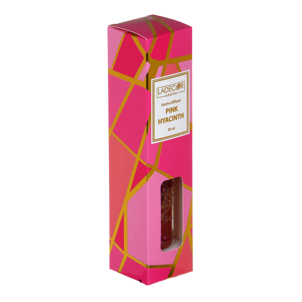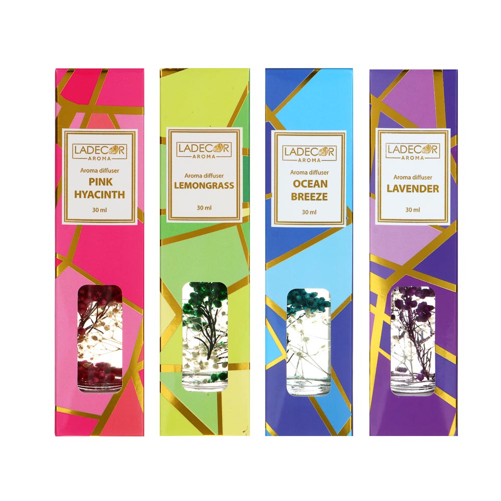 LADECOR Аромадиффузор 30мл с декором и с палочками, 4 вида лаванда,лемонграсс,роз.геоцинт,океан