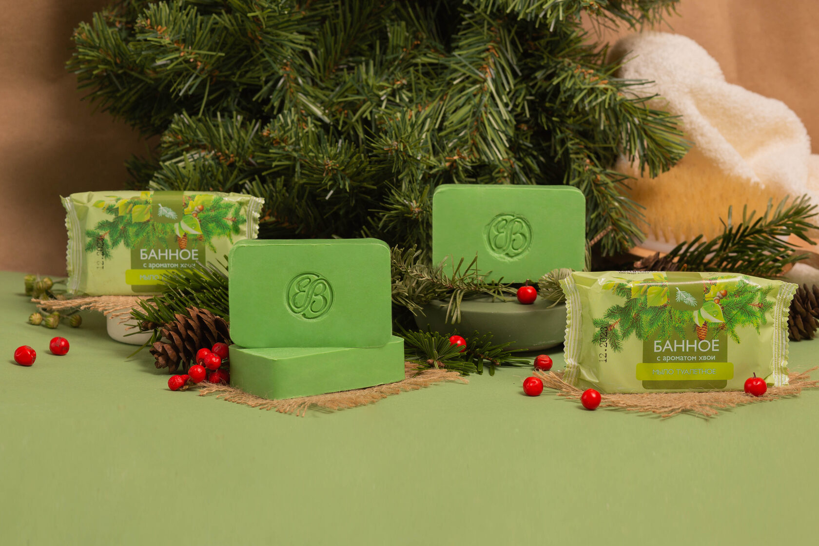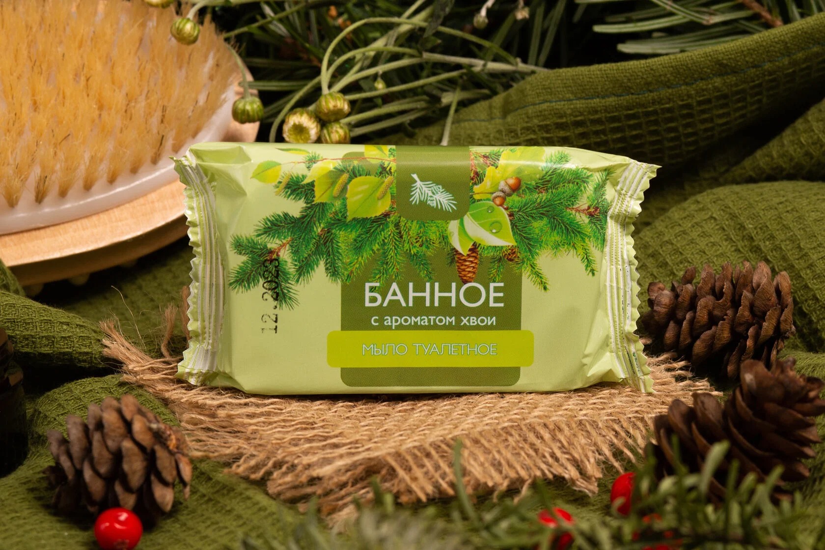 Мыло туалетное "Банное с ароматом хвои" вырабатывается из натурального органического сырья с добавлением высококачественных отдушек.