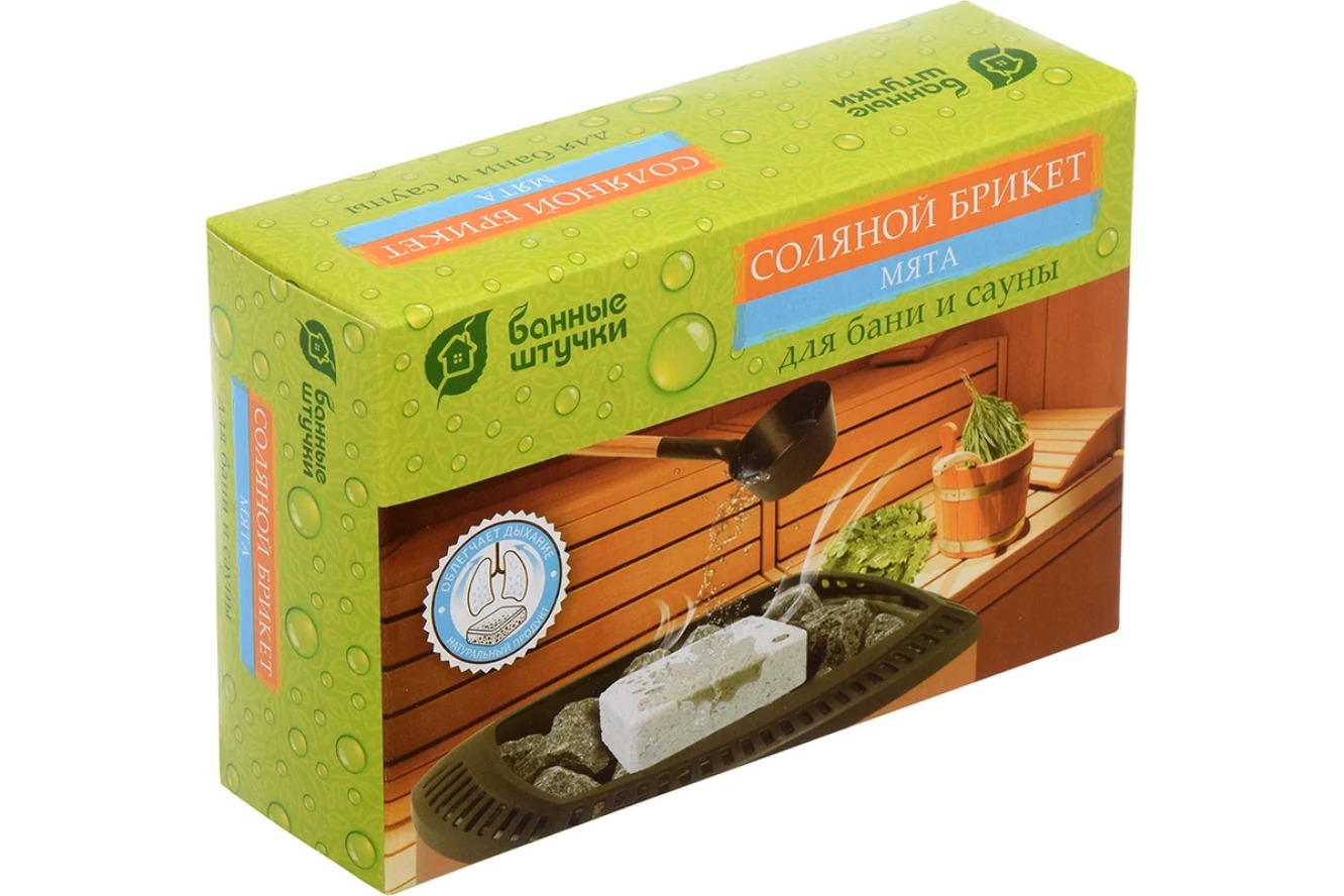 Массы соляного брикета с травами для бани и сауны "Банные штучки. Мята" хватает приблизительно на 10 посещений сауны или бани.