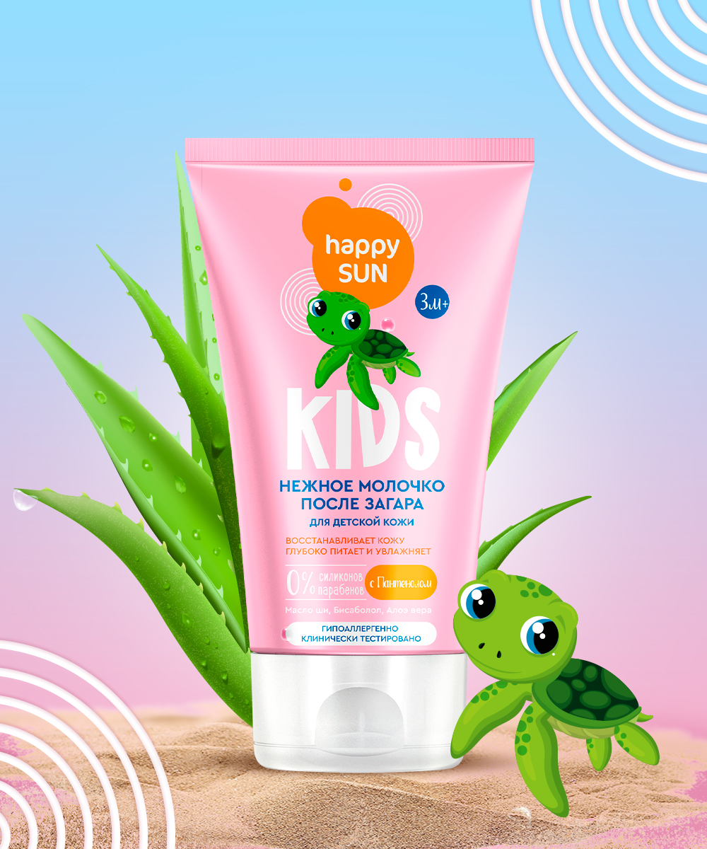Нежное молочко после загара для детской кожи Happy Sun (Хэппи сан) восстанавливает нежную кожу малышей, смягчает и возвращает чувство комфорта.