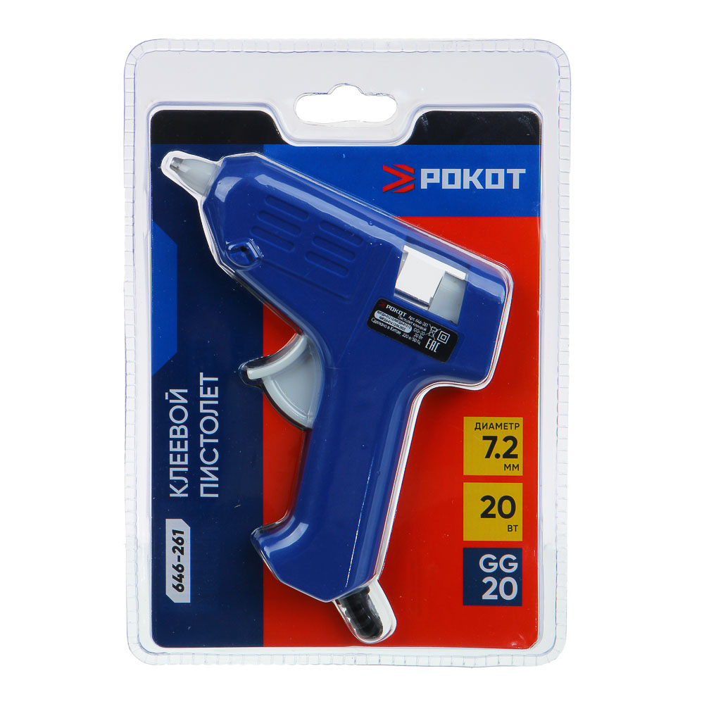 РОКОТ ПИСТОЛЕТ КЛЕЕВОЙ ЭЛЕКТРИЧЕСКИЙ GG-20, 20ВТ.НАГРЕВ 3-5 МИН, 6 ГР/МИН, +2 СТЕРЖНЯ 7ММ.