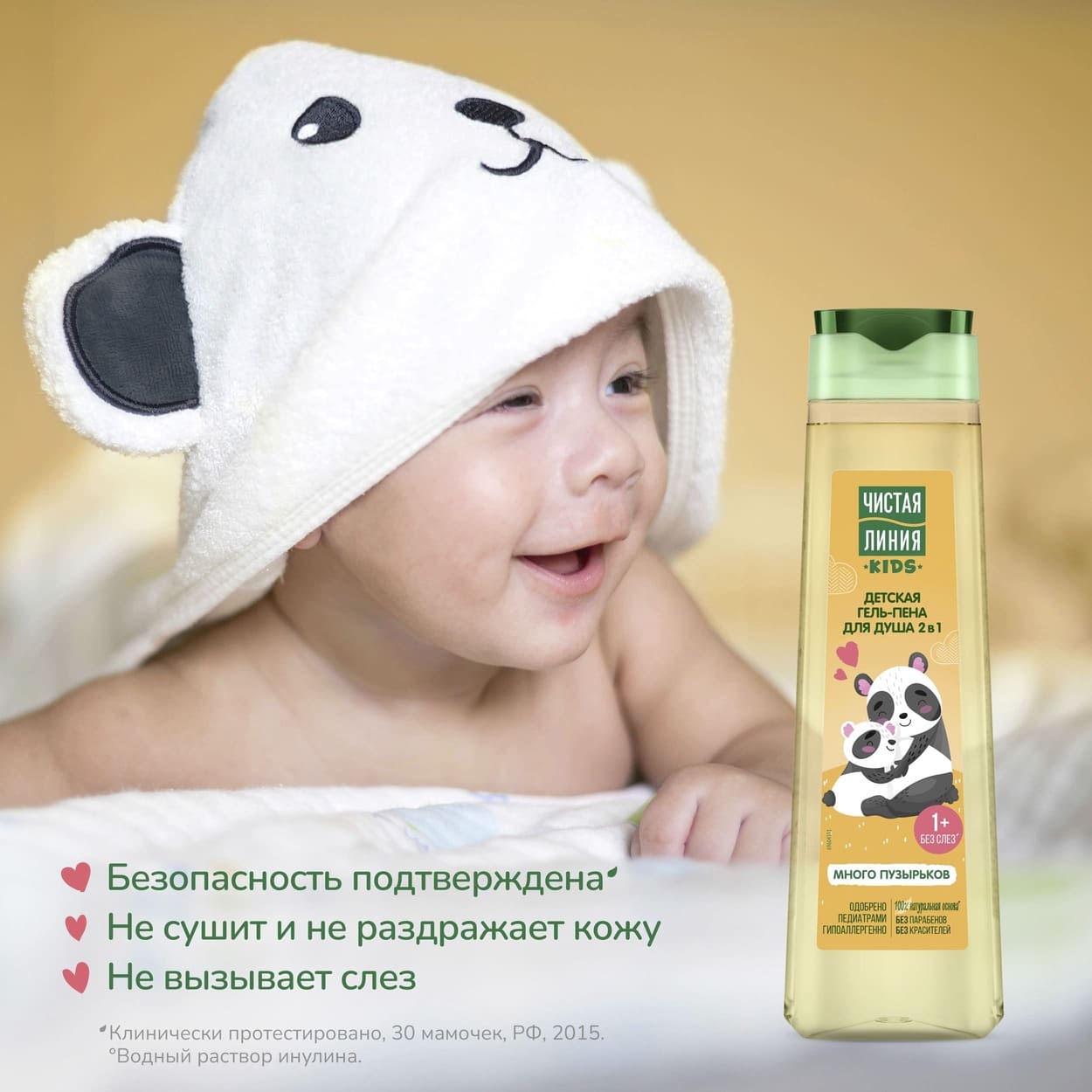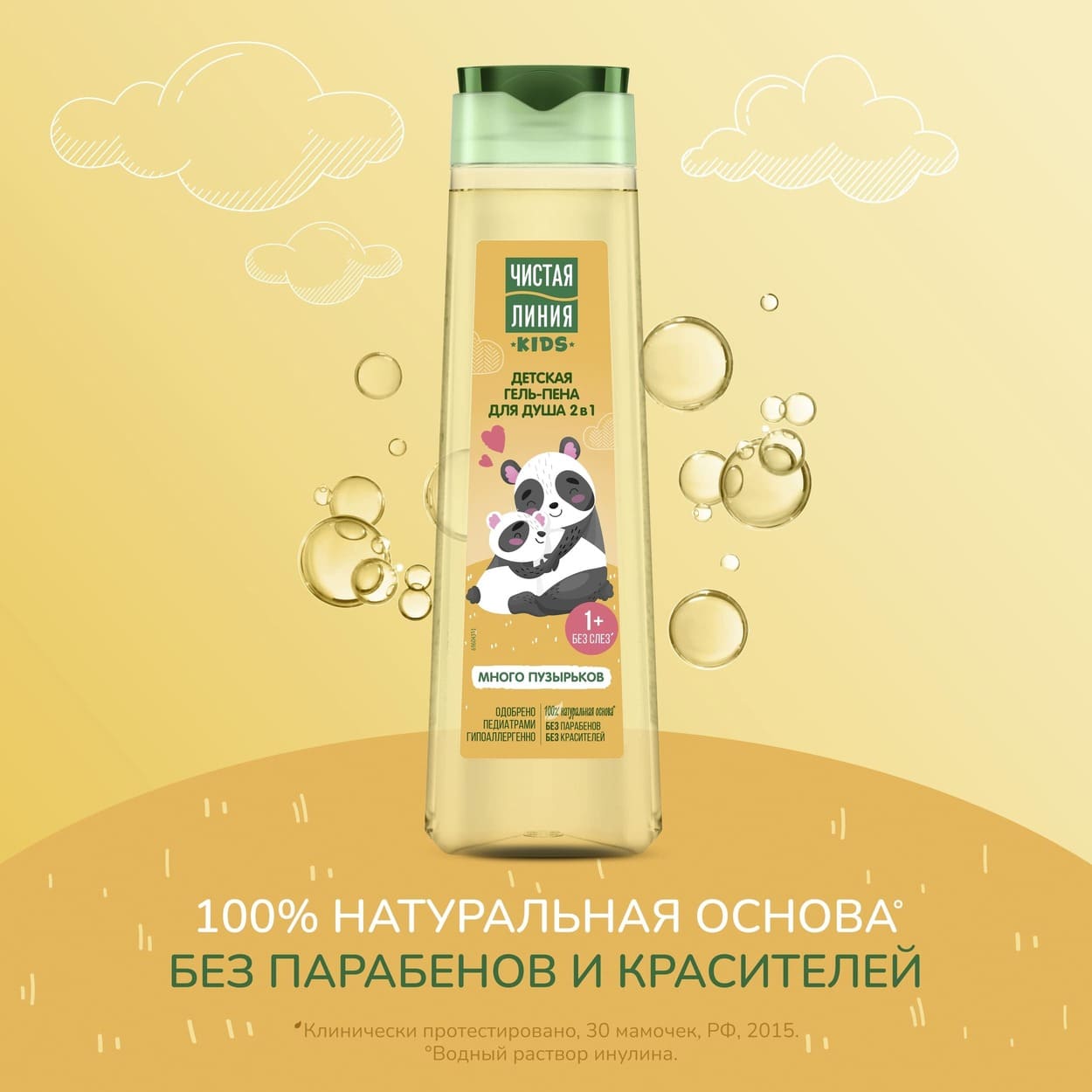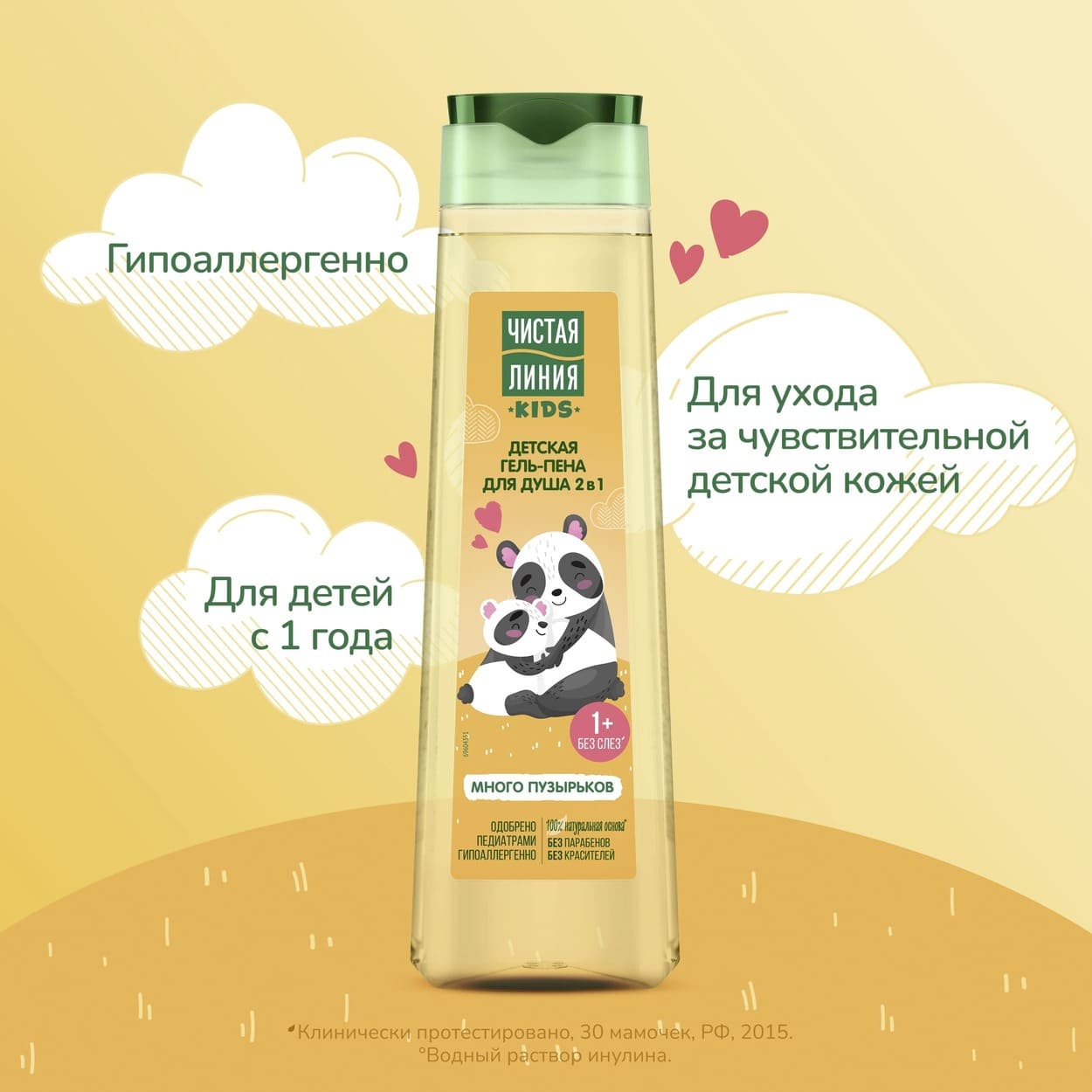 Натуральный продукт бренда «Чистая линия» - детская гель-пена 2в1 для душа Kids 1+, разработан специально для нежной детской кожи, для детей в возрасте 1+.