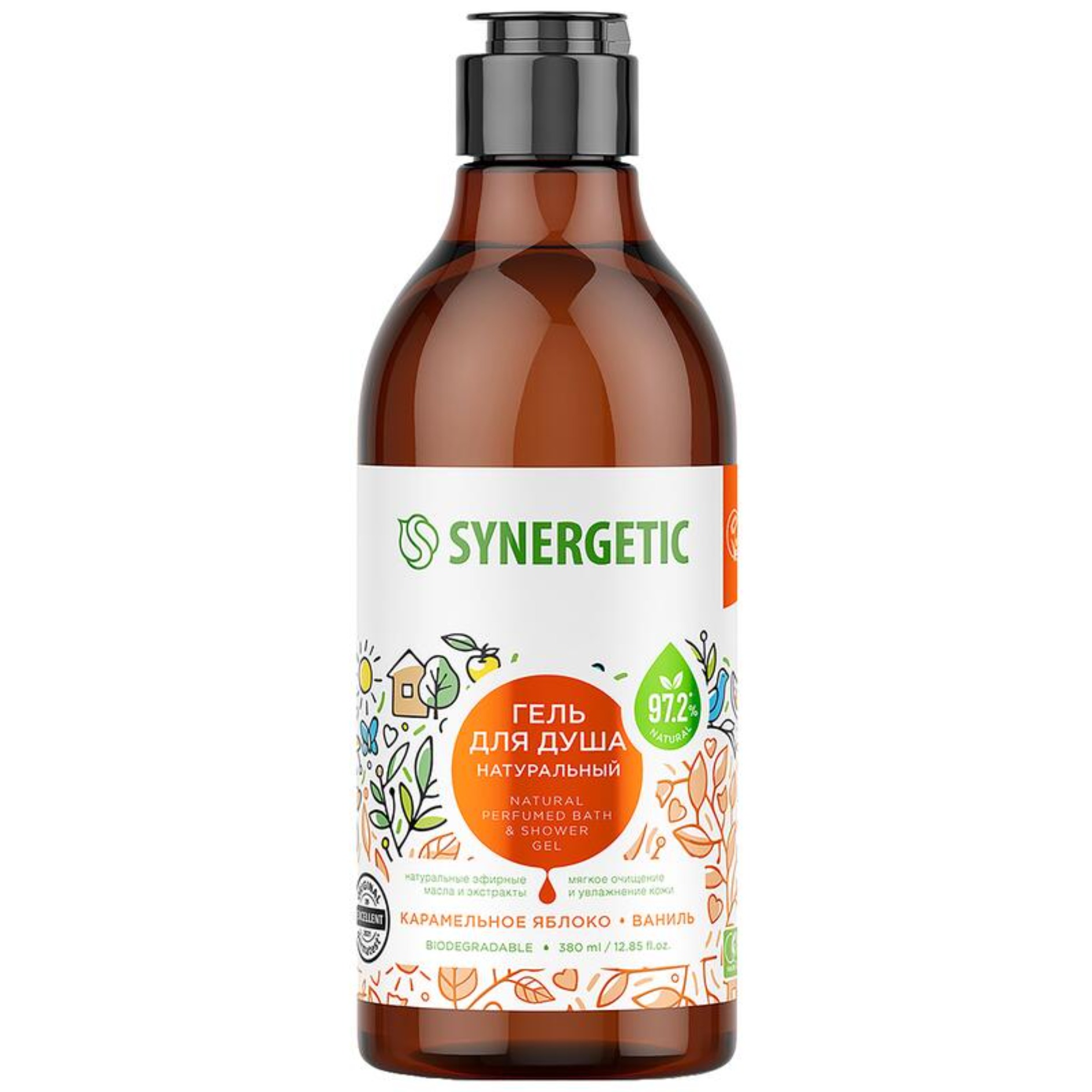 Аппетитный и легкий аромат натурального геля для душа SYNERGETIC (Синергетик) «Карамельное яблоко и ваниль» — это композиция из 99% натуральных компонентов.