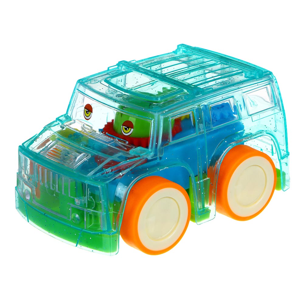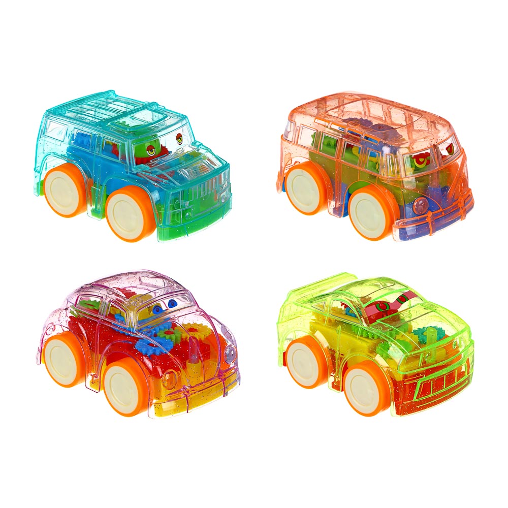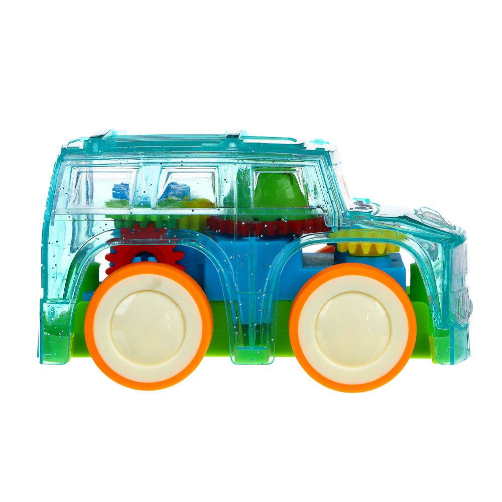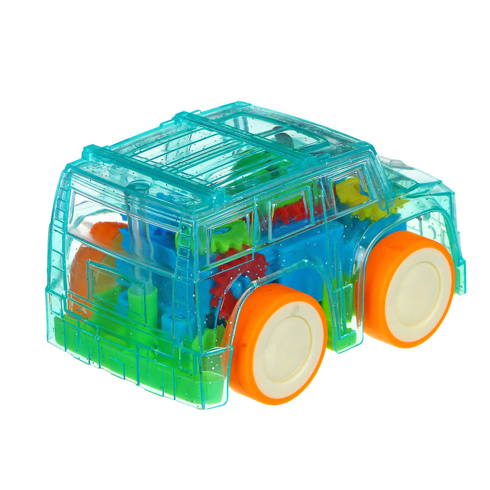 Машинка имеет прозрачный пластиковый корпус, а внутри заполнен яркими разноцветными шестеренками, которые двигаются во время движения транспорта, завораживая и приводя ребенка в восторг.