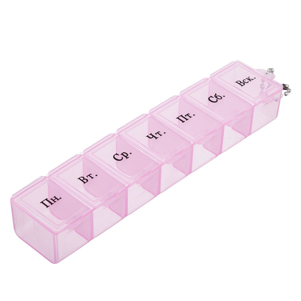Изготовлен из прочного пластика. Удобная цепочка позволяет вам легко носить контейнер с собой, гарантируя доступность ваших лекарств в любое время.