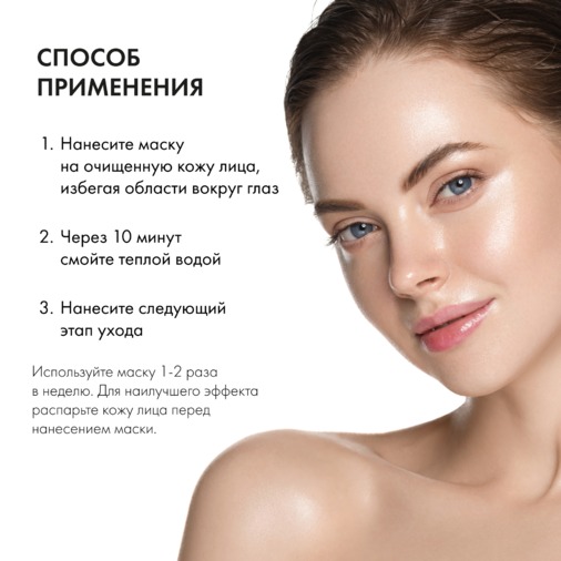 Способ применения: нанесите маску-скраб на влажную кожу лица избегая области вокруг глаз и губ, слегка помассируйте, уделяя особое внимание Т-зоне, оставьте на 8-10 минут, а затем смойте тёплой водой.