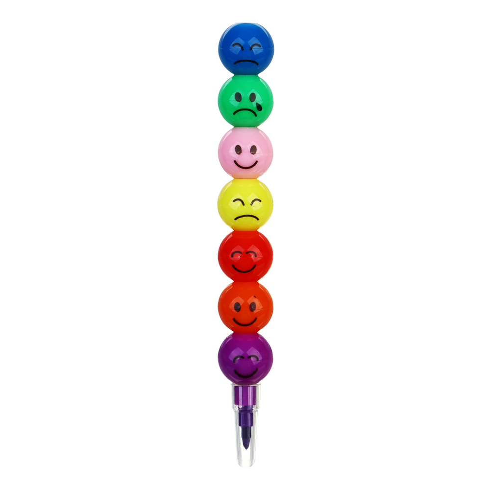 Карандаш выполнен на основе воска и состоит из 7 разноцветных элементов в форме смайликов, которые легко вставляются друг в друга.