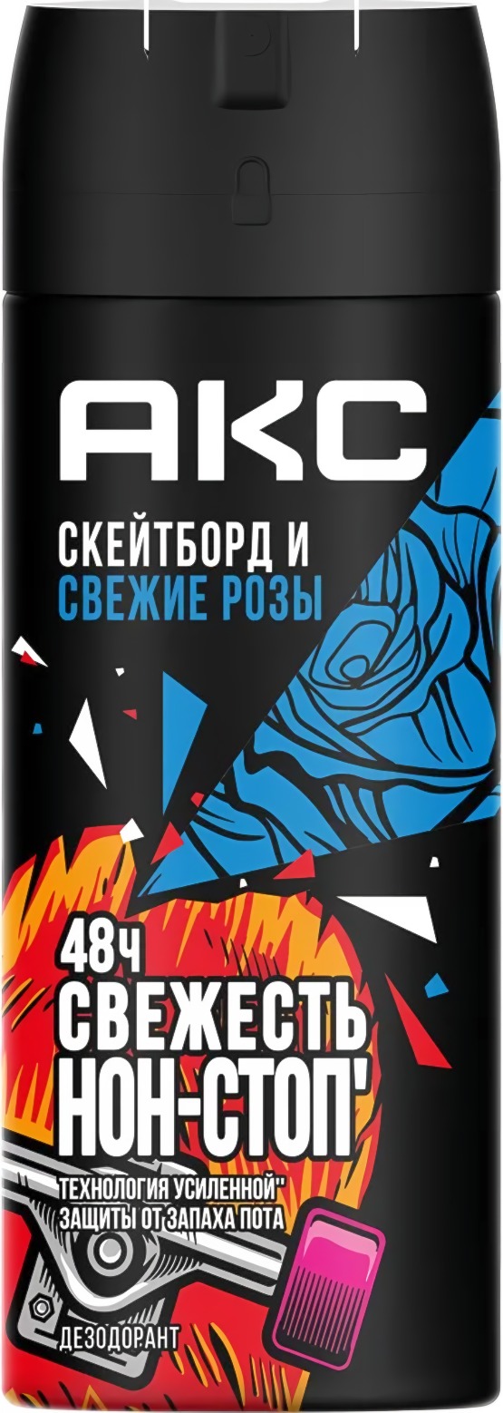 Дезодорант AXE (Акс) "Скейтборд и свежие розы" — это аромат крутого парня, уверенного в себе на все 100%.