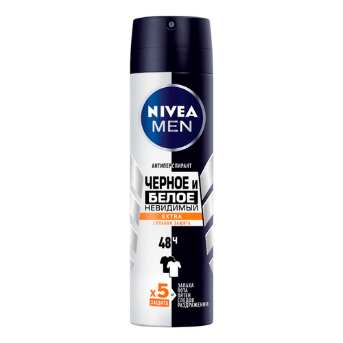 Дезодорант-антиперспирант спрей NIVEA MEN EXTRA (Нивеа мен экстра) "Черное и Белое Невидимый" предотвращает появление белых пятен на темной одежде и желтых пятен на светлой.