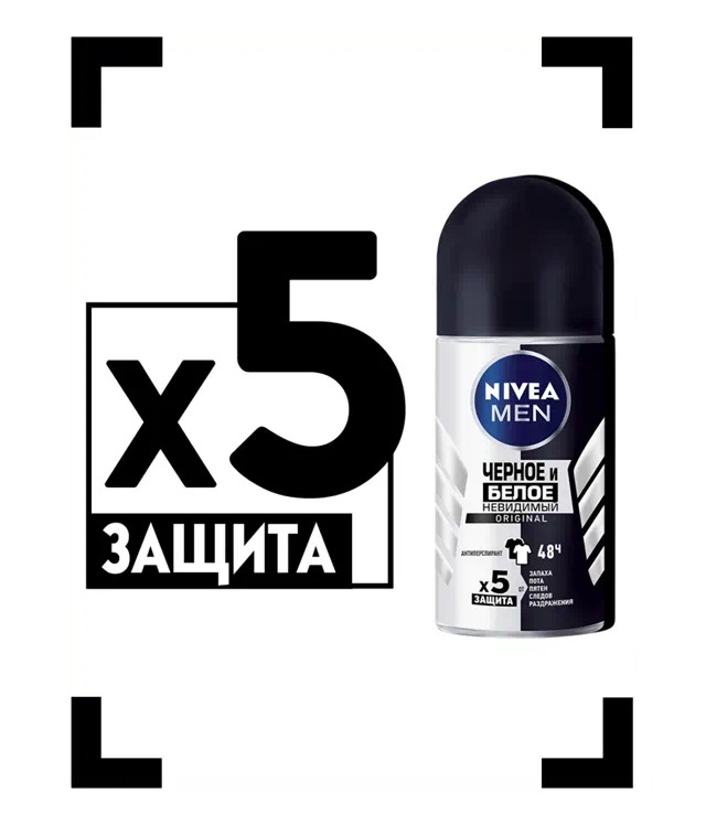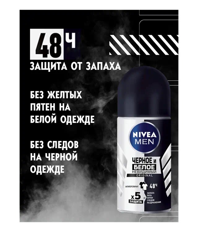 Роликовый дезодорант-антиперспирант Nivea Men (нивеа мен) "Невидимый для черного и белого" предотвращает появление белых пятен на темной одежде и желтых пятен на светлой.