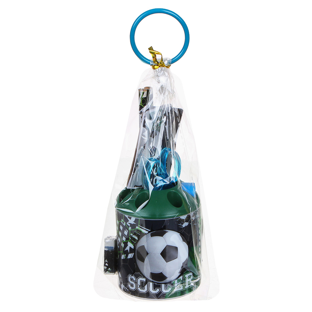 Набор канцелярский в стакане «Соккер» – это подарочный комплект канцелярских принадлежностей для мальчика, выполненный в зеленом цвете.