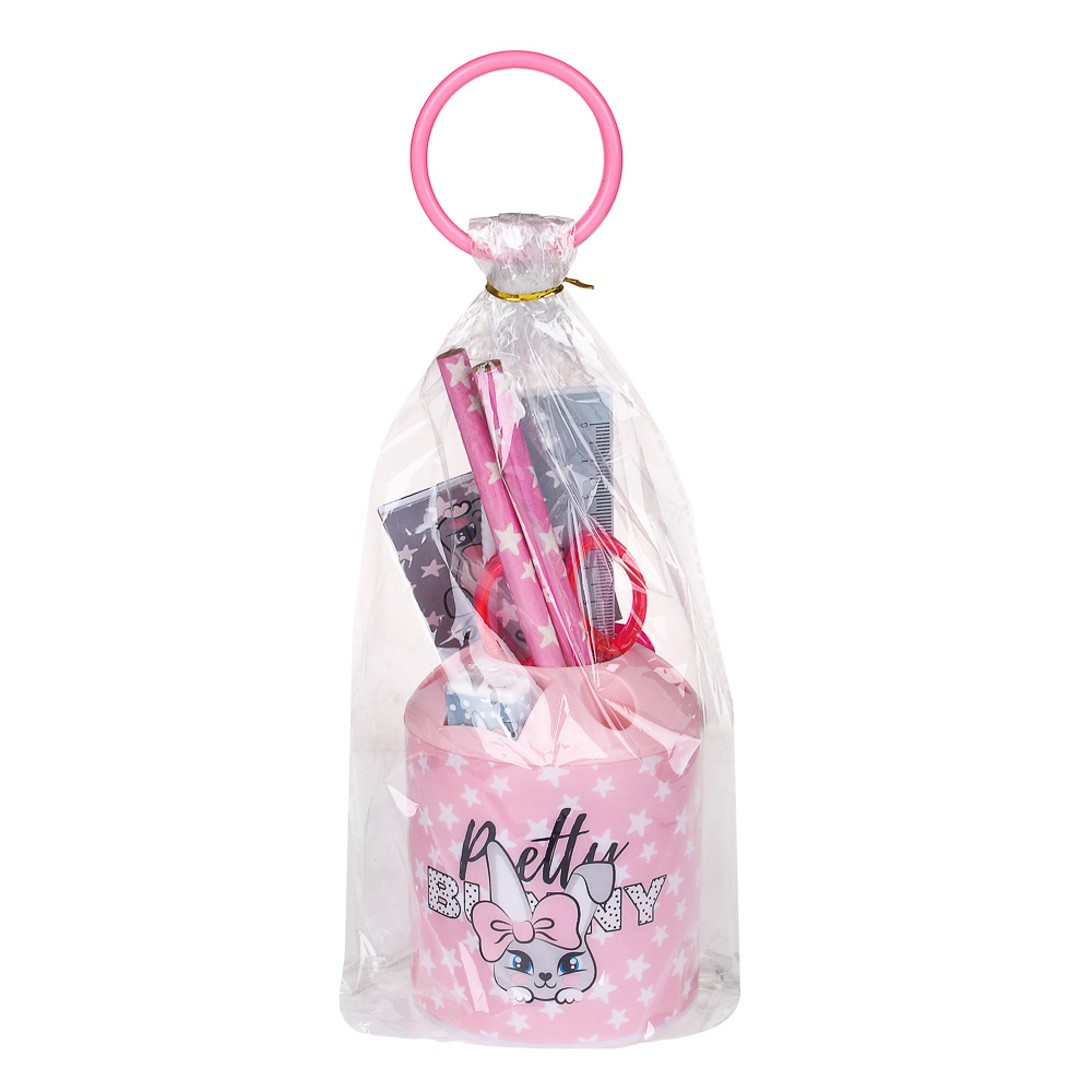 Набор канцелярский в стакане «Зайчик» – это подарочный комплект канцелярских принадлежностей для девочки, выполненный в розовом цвете.