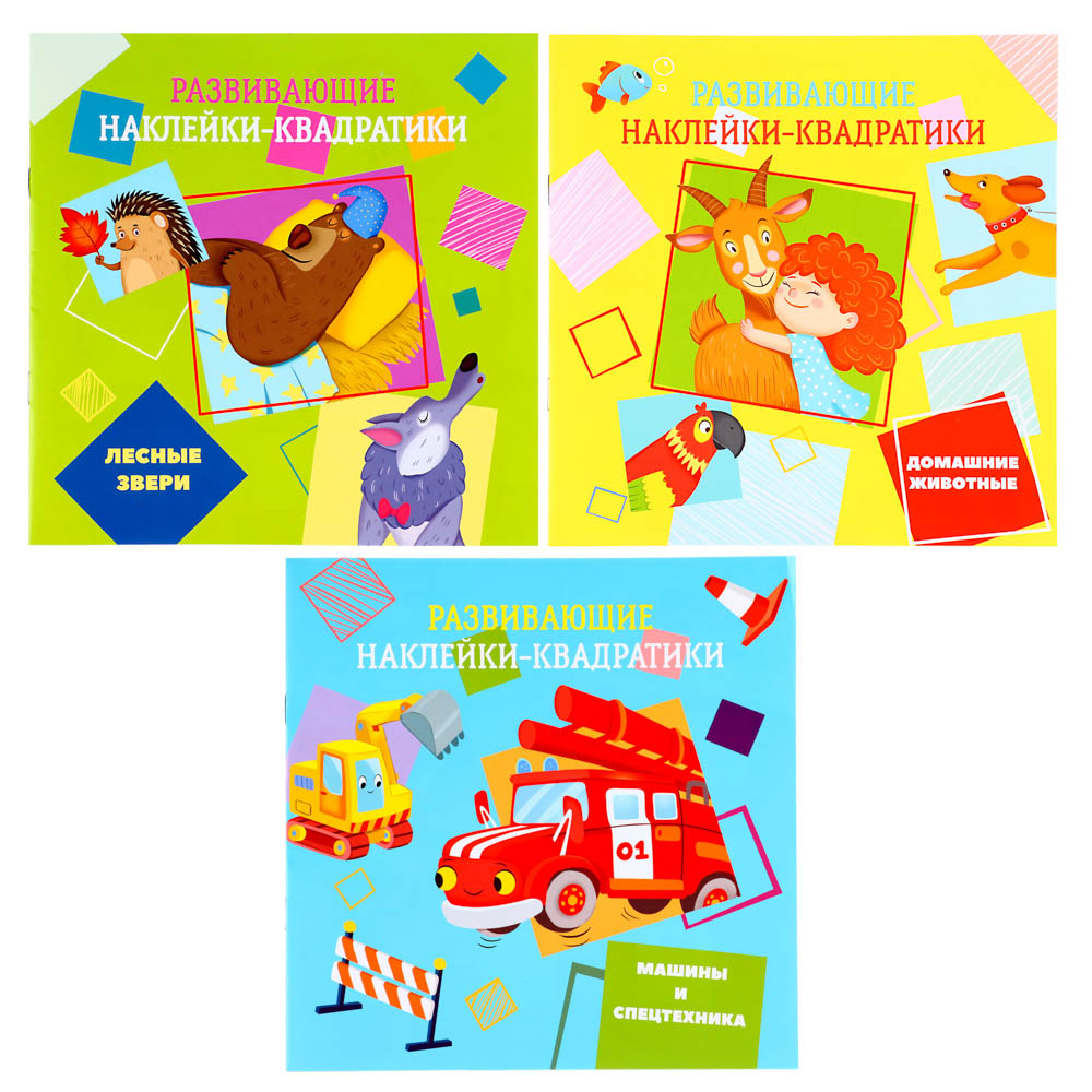 Книга аппликация Развивающие наклейки-квадратики от издательства УИД – это серия из трех книжек, посвящённых различным тематикам.