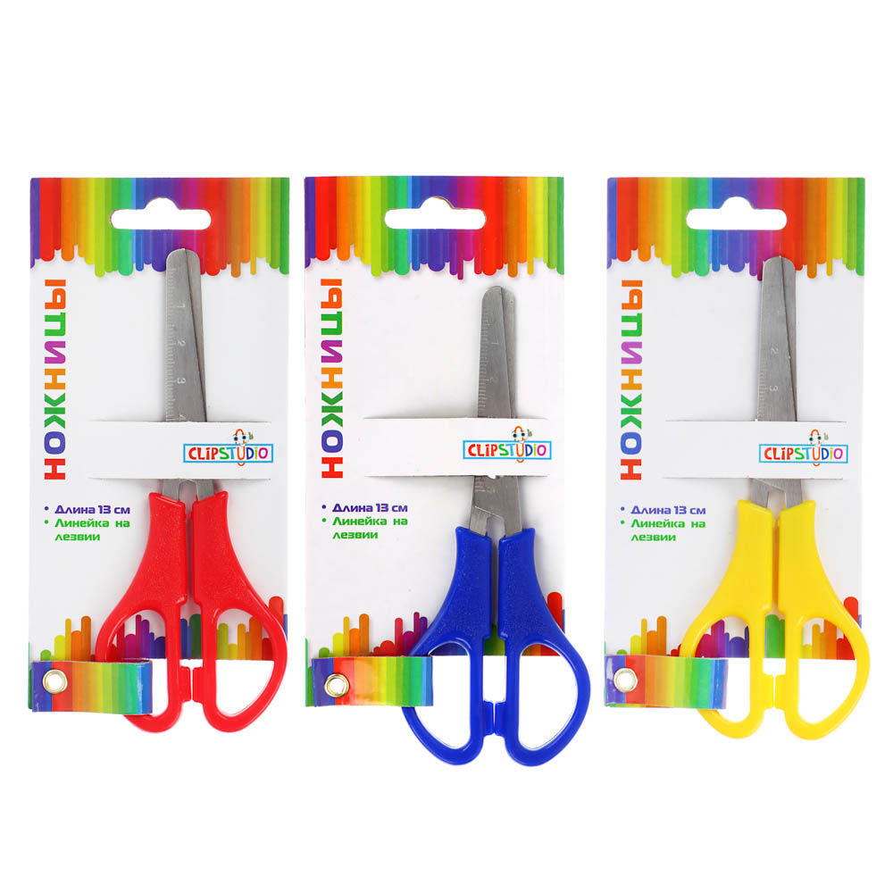 ClipStudio Ножницы школьные 13см с линейкой, пластиковые ручки, 3 цвета, на карточке с подвесом