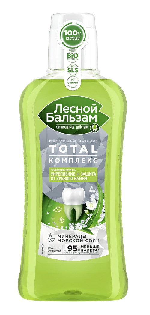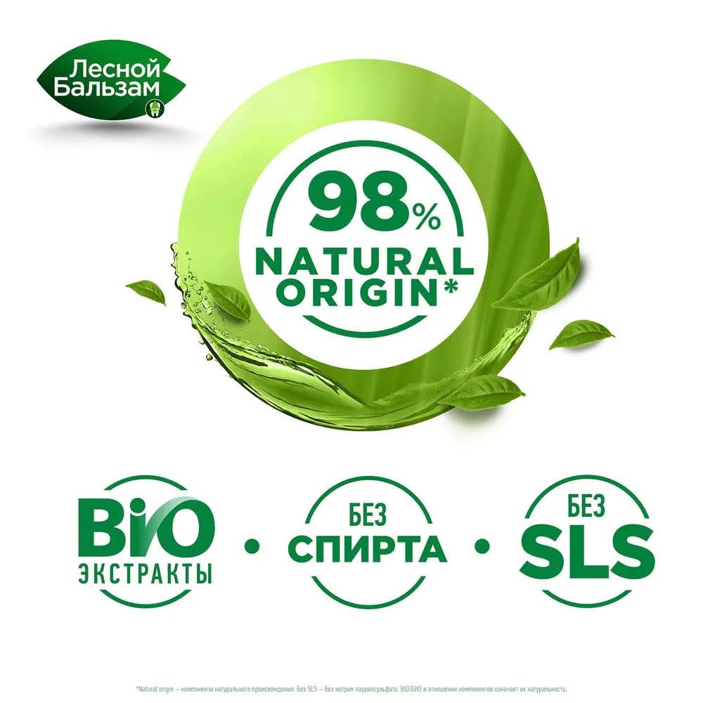 Формула ополаскивателя Лесной бальзам Природная свежесть на 98% состоит из ингредиентов натурального происхождения, интенсивно очищает зубы от налета, защищает от зубного камня и препятствует развитию кровоточивости десен, обеспечивая комплексную защиту всей полости рта, усилена минеральными компонентами и экстрактами трав.