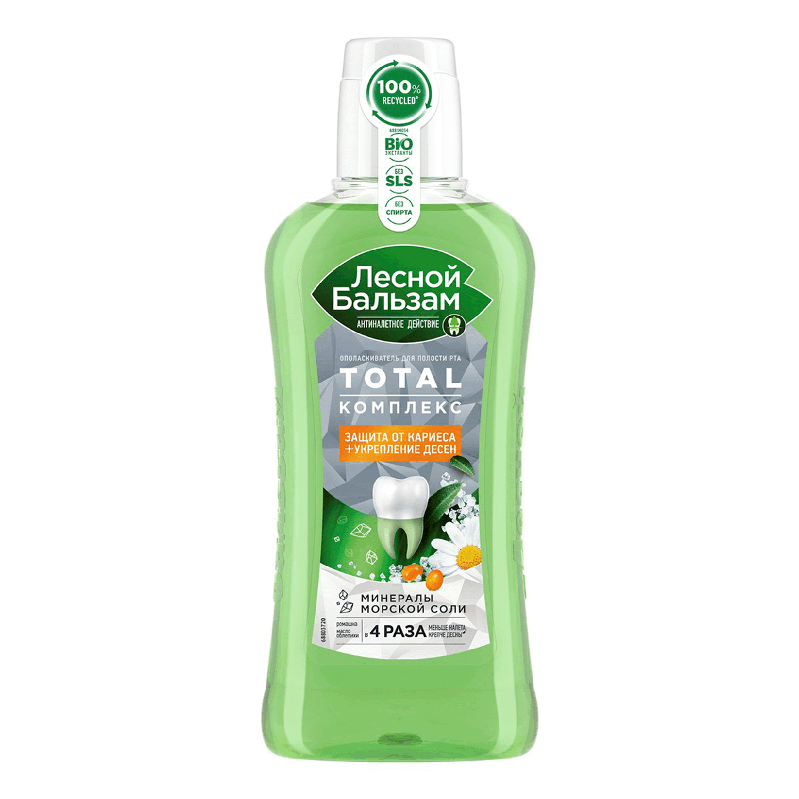 Формула ополаскивателя Лесной бальзам TOTAL Комплекс с морской солью, экстрактом ромашки и маслом облепихи эффективно борется с первопричиной развития серьезных проблем полости рта – зубным налетом, качественно удаляет налет в труднодоступных для щетки местах, снижает скорость появления налета на зубах в течение дня, защищает от зубного камня, укрепляет зубы и десны.