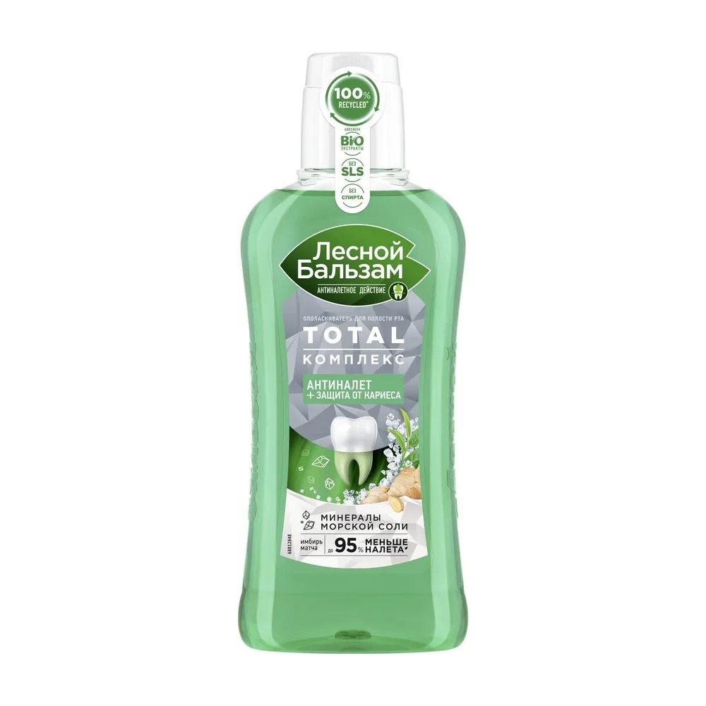 Ополаскиватель для десен Лесной бальзам Total комплекс с морской солью, экстрактом имбиря - новый ополаскиватель для комплексной защиты зубов и десен, в составе которого 98% ингредиентов натурального происхождения.