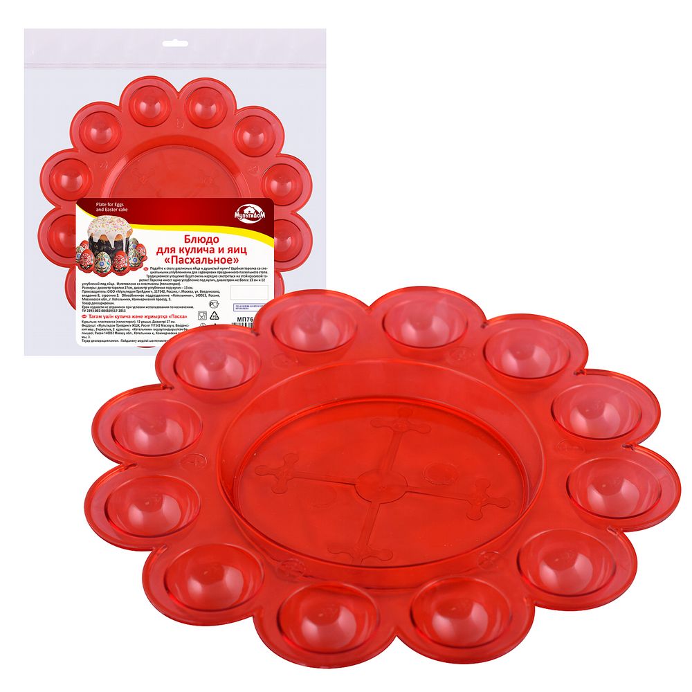 Блюдо имеет одно углубление под кулич, диаметром не более 13 см и 12 углублений под яйца.