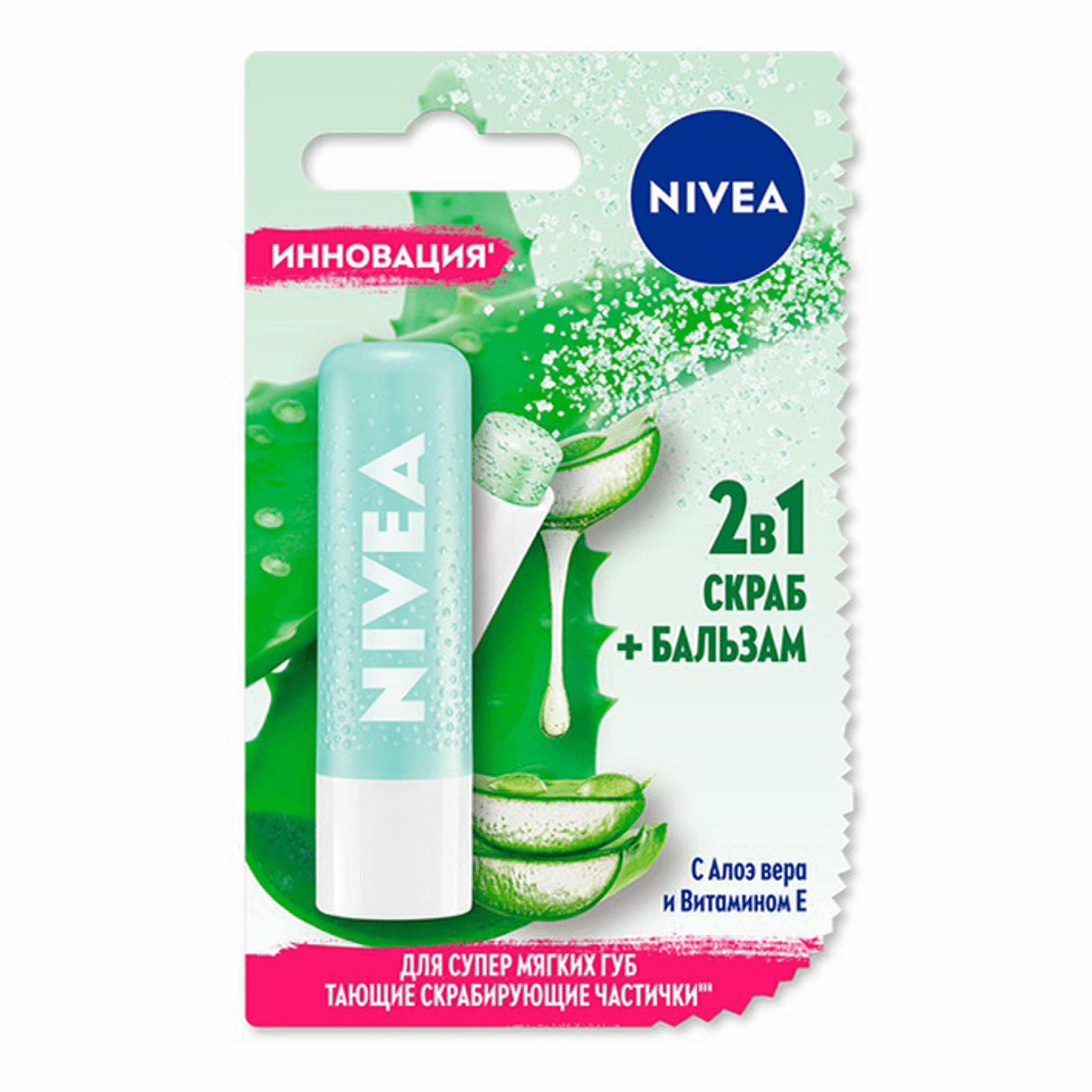Скраб + бальзам для губ 2в1 Nivea (Нивеа) с алоэ вера и витамином E и ухаживает за кожей губ.