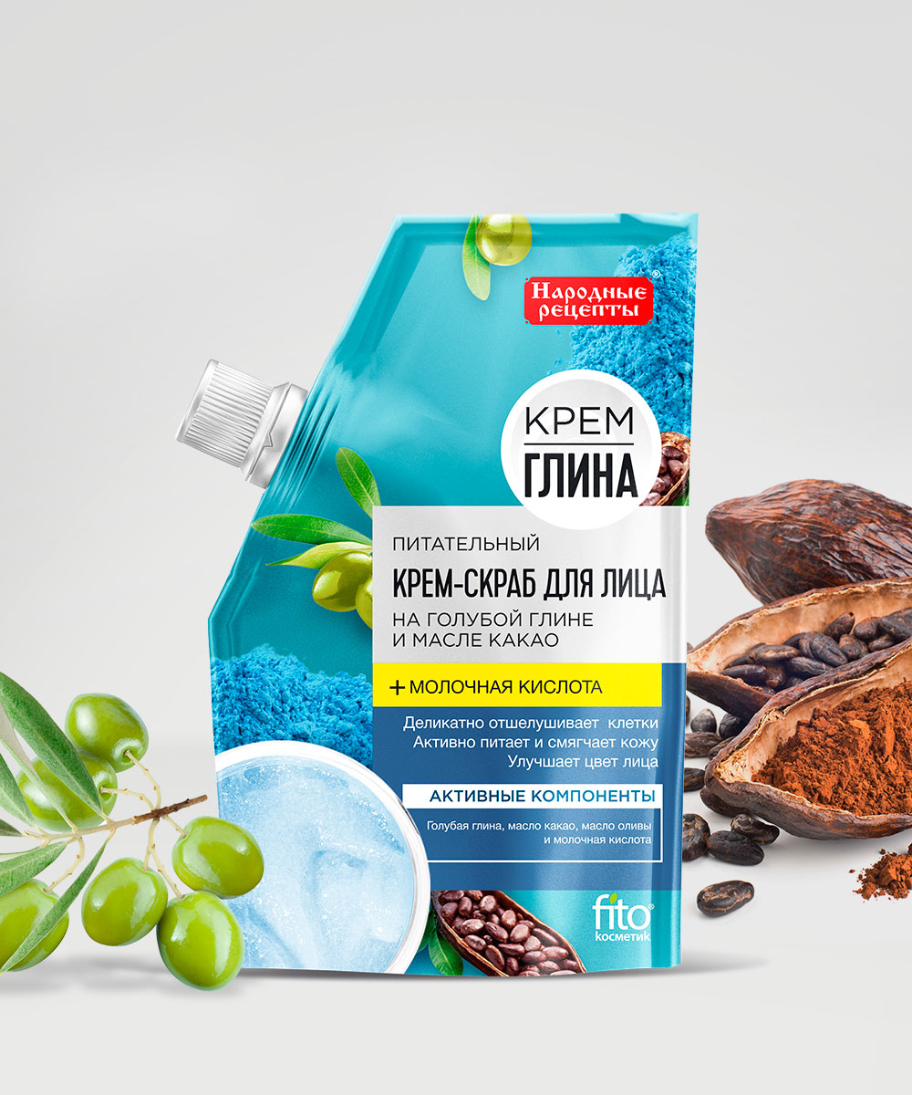 Крем-скраб для лица на голубой глине и масле какао Народные рецепты "Питательный" глубоко очищает и бережно устраняет несовершенства.