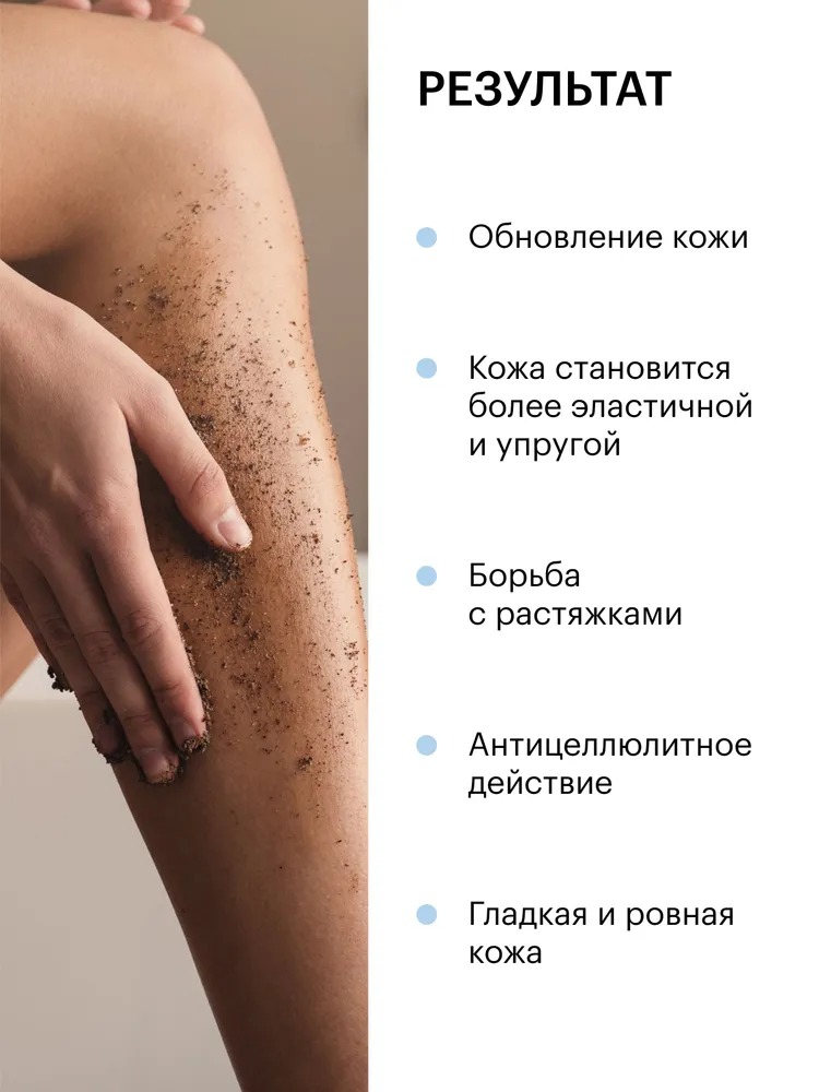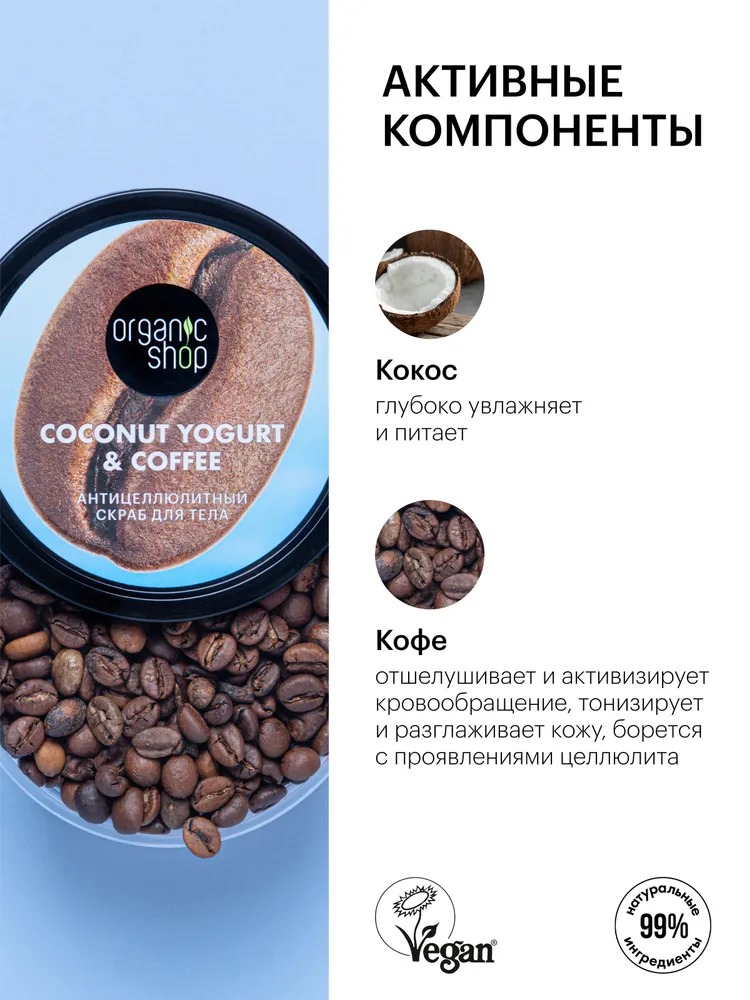 Благодаря отличному скрабирующему эффекту молотого кофе и кокосового йогурта кожа становится более ровной, гладкой и ухоженной.