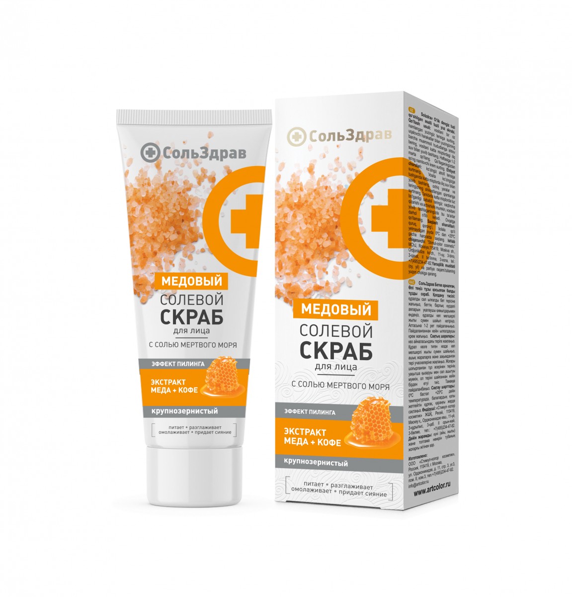 Солевой скраб для лица СольЗдрав "Медовый" на основе соли мертвого моря с экстрактом меда и кофе делает кожу чистой, увлажняет, сужает поры и сокращает количество черных точек.