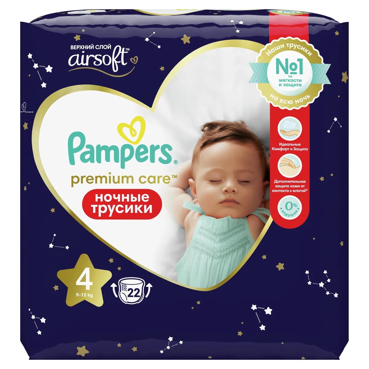 Ночные трусики-подгузники Pampers Premium Care Maxi (Памперс Премиум Кэа Макси) с новым ультрамягким и дышащим верхним слоем Airsoft (Эирсофт).