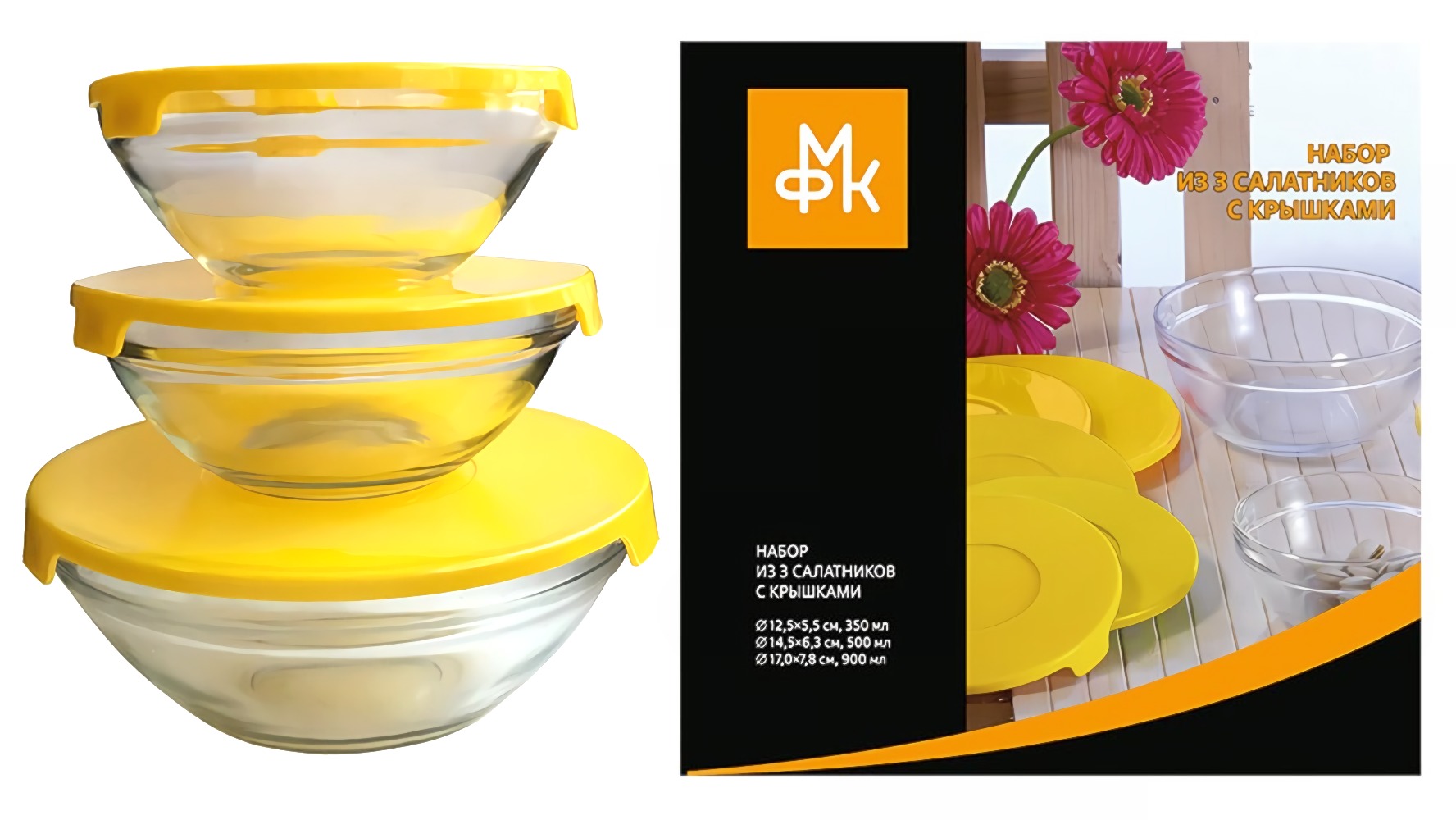 Набор 3 салатников с жёлтыми крышками:350мл, 500мл, 900мл