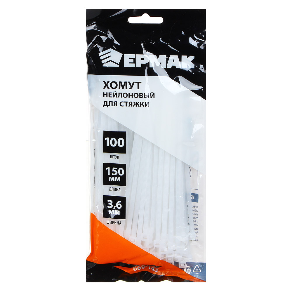 Нейлоновый хомут для стяжки ЕРМАК 3,6х150 мм белого цвета используется для фиксации, стяжки и крепления кабелей, проводов, шлангов в пучок во время монтажа электропроводки, а также для бытовых целей.