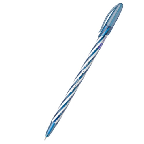 Яркая одноразовая шариковая синяя ручка с утонченным игольчатым типом пишущего узла имеет матовый полупрозрачный круглый корпус, напоминающий карамельную конфету, и вентилируемый колпачок.