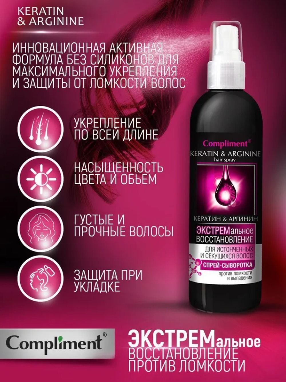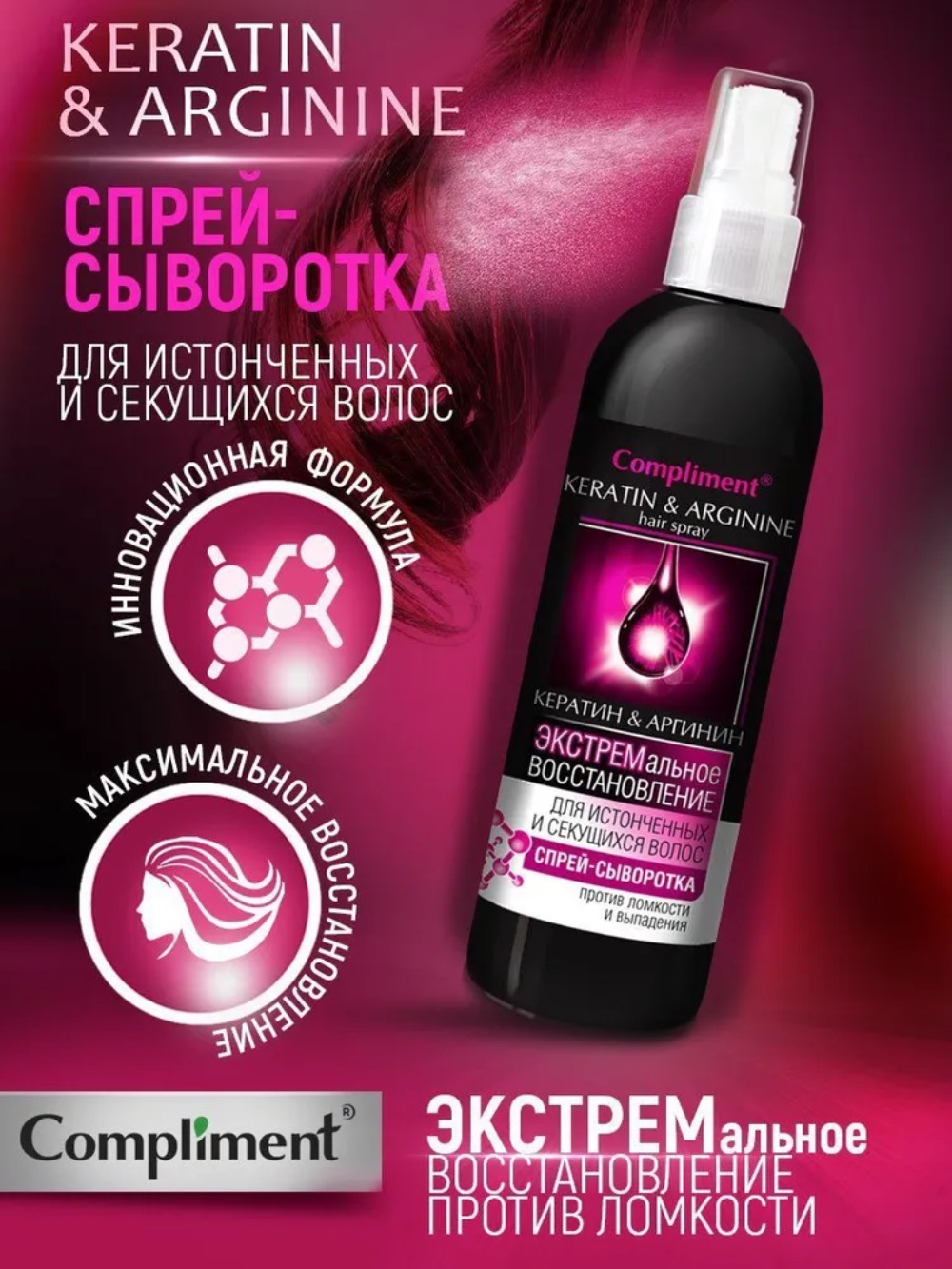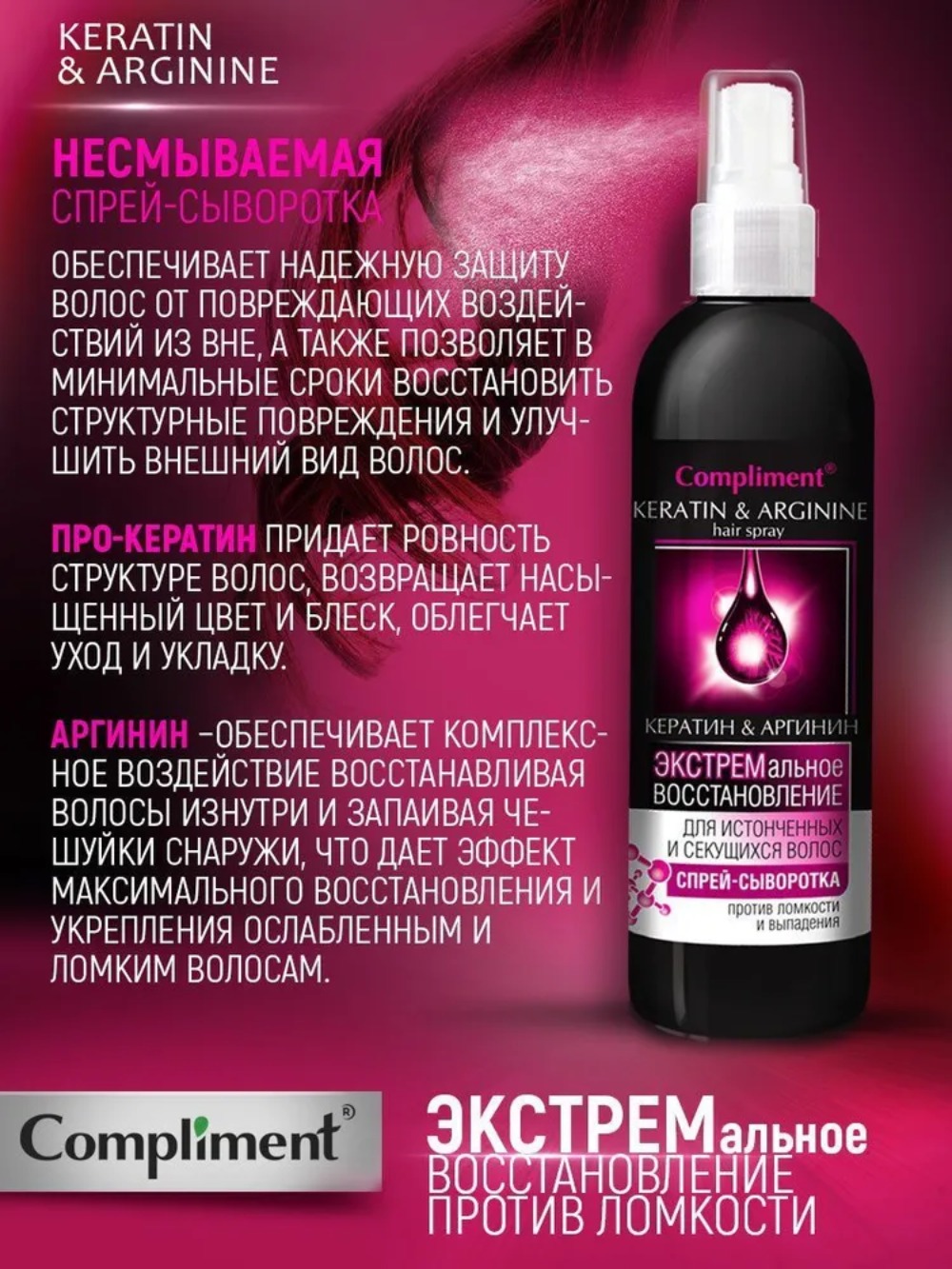 Несмываемая спрей-сыворотка Compliment (Комплимент) Кератин&Аргинин "Для истонченных и секущихся волос" обеспечивает надежную защиту волос от повреждающих воздействий из вне, а также позволяет в минимальные сроки восстановить структурные повреждения и улучшить внешний вид волос.