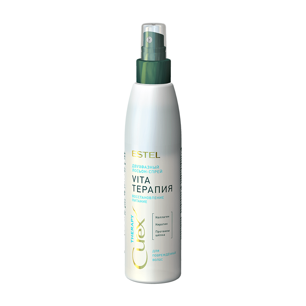 Двухфазный лосьон-спрей для повреждённых волос Estel Curex Therapy "Эстель курекс терапи. Восстановление и питание" восстанавливает естественный уровень pH, закрывает кутикулу, выравнивает и уплотняет структуру волос.
