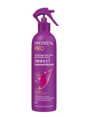 Спрей для волос Прелесть Professional "Эффект ламинирования" - это эффективная защита от повреждений при температуре до 220 градусов (фен - 80 градусов, плойка от 140, утюжок - от 180).