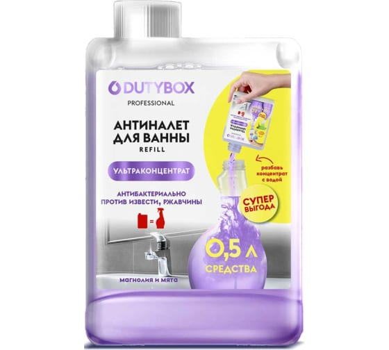 Концентрат для ванны Dutybox "Антиналет" поможет вам поддерживать вашу ванну в идеальном состоянии, придавая ей свежесть и блестящий вид.