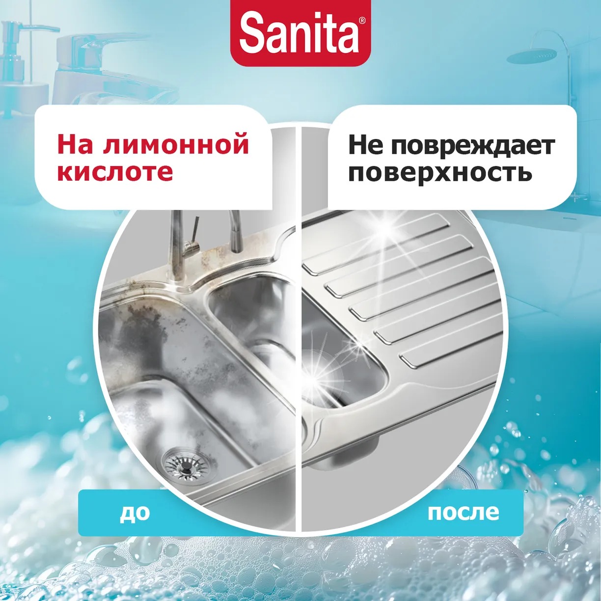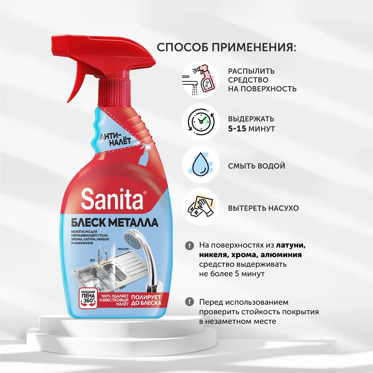 Sanita (Санита) "Блеск металла" средство предназначено для чистки и бережного ухода за поверхностями из нержавеющей стали: кранами, вытяжными шкафами и прочими поверхностями.