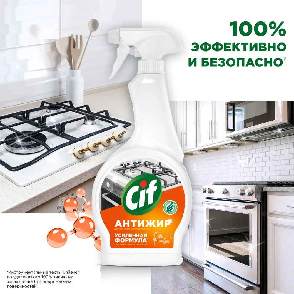 Уникальная формула спрея Cif с активными компонентами и маслами апельсина и мандарина начинает действовать мгновенно, проникая вглубь и растворяя жир, масло, остатки пищи и пригоревшую еду.