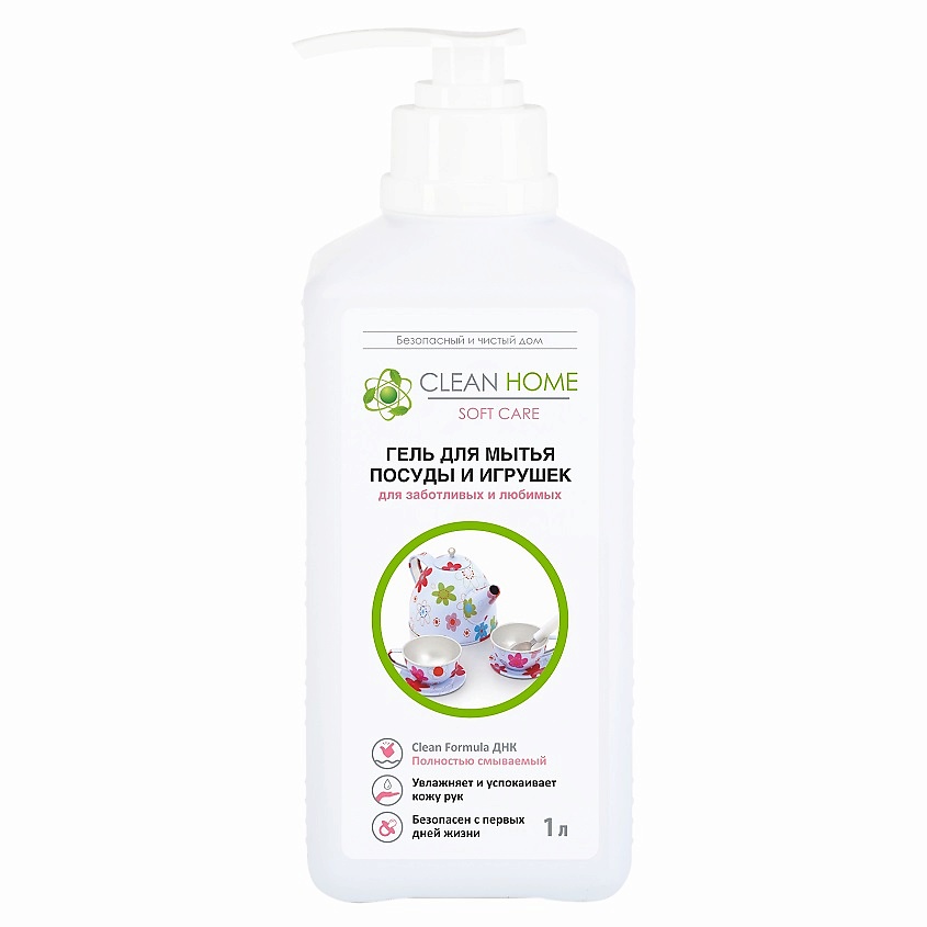 Гель для мытья детской посуды и игрушек с дозатором CLEAN HOME (Чистый дом) предназначен для мытья детской посуды, бутылочек из стекла и пластика, сосок из латекса и силикона, всех видов игрушек (кроме мягких), гигиенических принадлежностей, а также мытья любых поверхностей с которыми соприкасается ребенок с первых дней жизни.