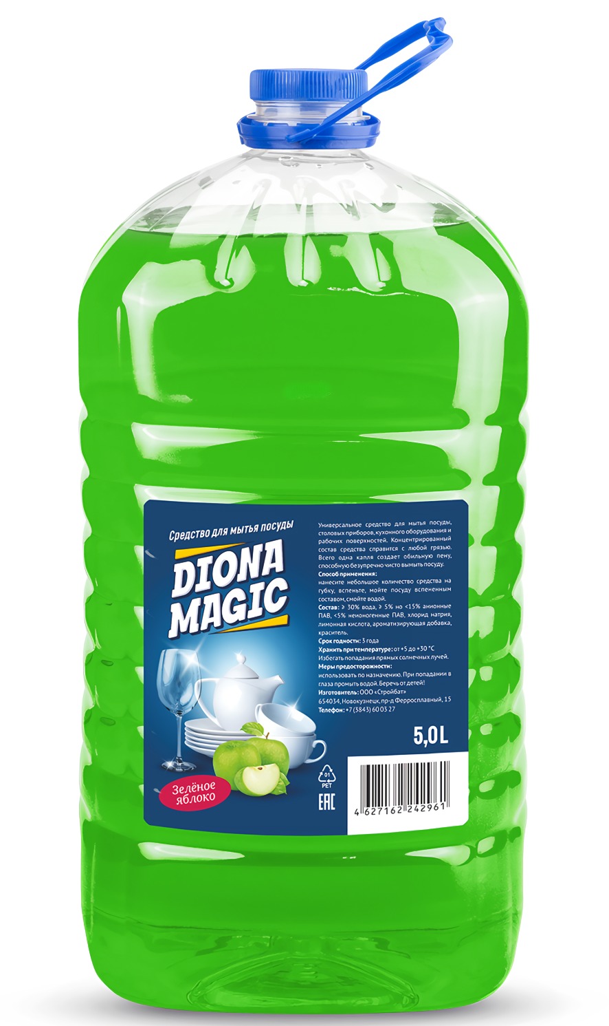 Гель для мытья посуды Diona Magic (Диона Мэджик) "Зеленое яблоко" идеально подходит для удаления жира и остатков пищи с любых столовых приборов, кухонного оборудования и рабочих поверхностей.