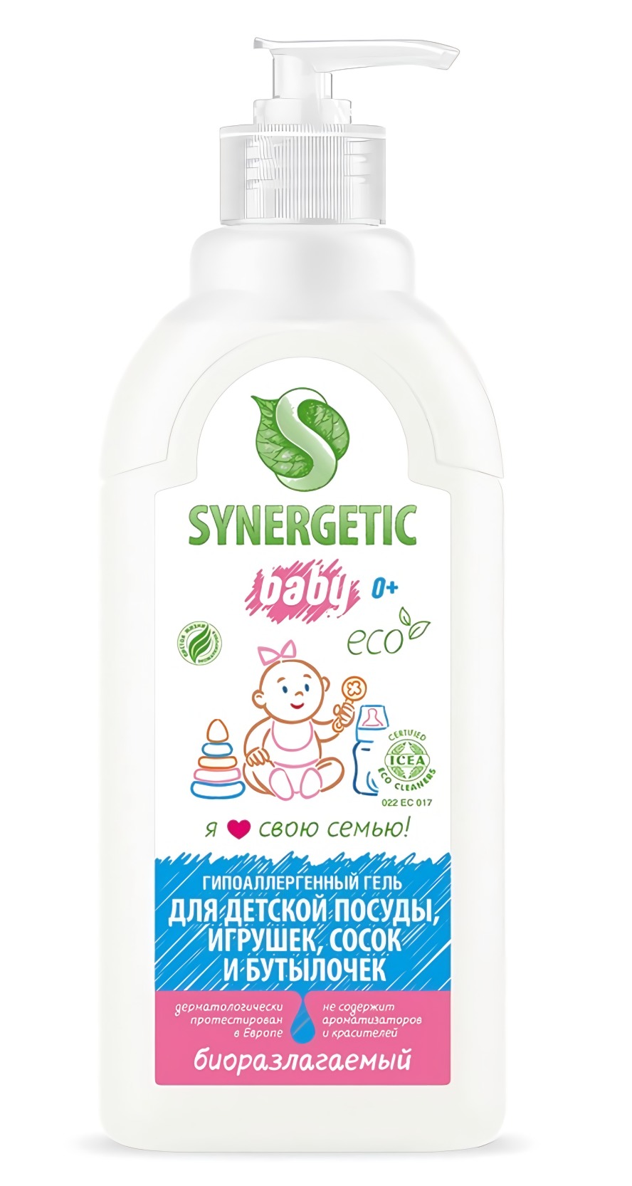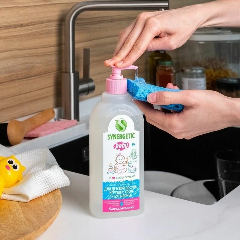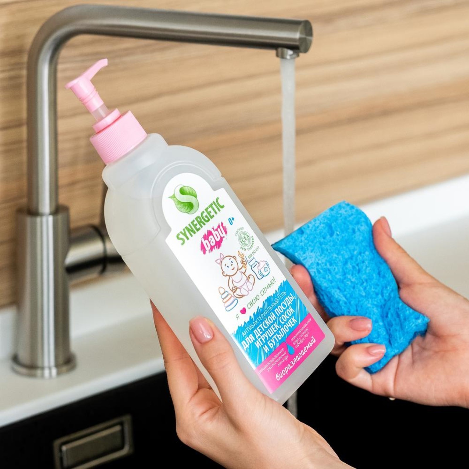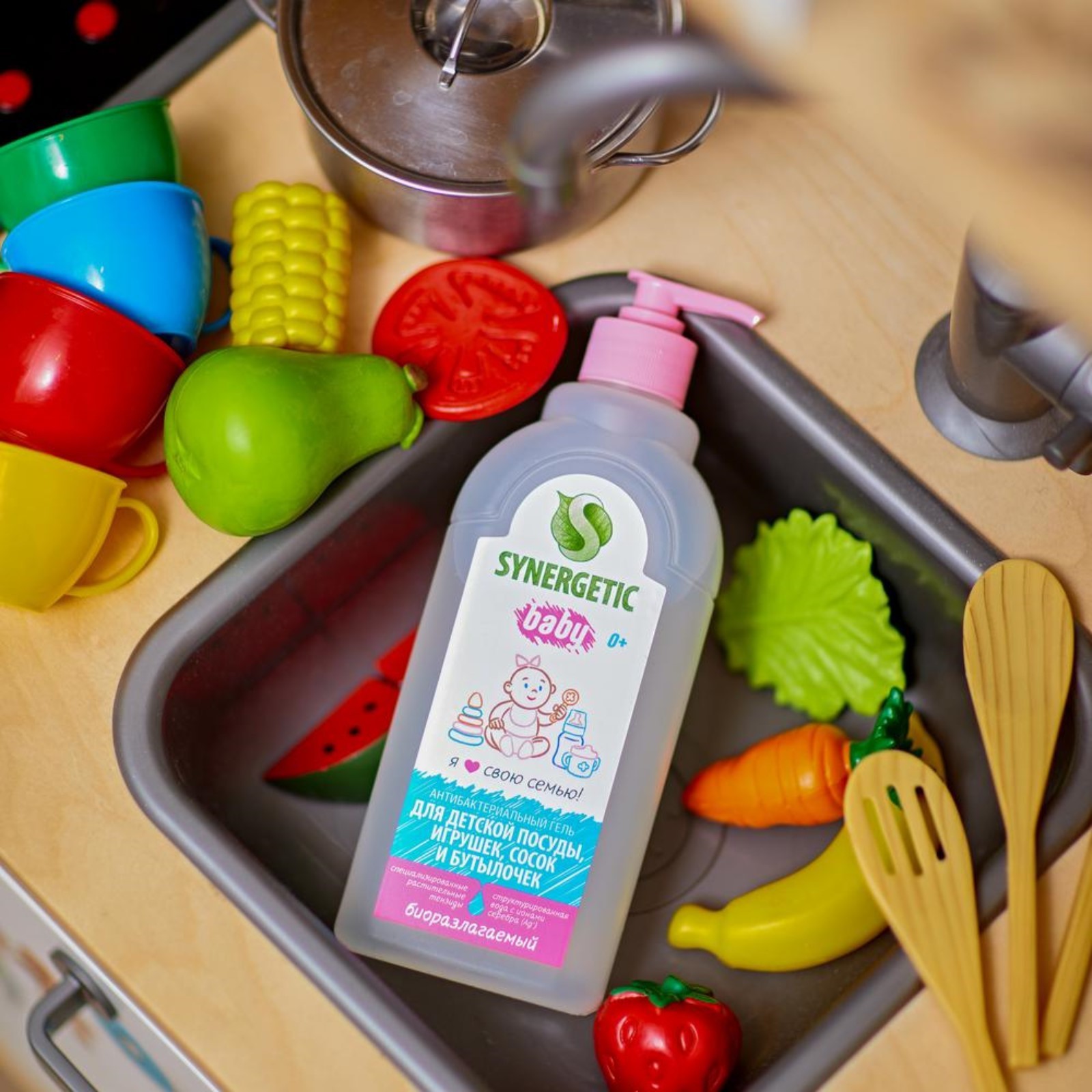 Биоразлагаемое средство Synergetic (Синергетик) подходит для мытья фруктов и овощей, а также детских аксессуаров: посуды, сосок, игрушек.