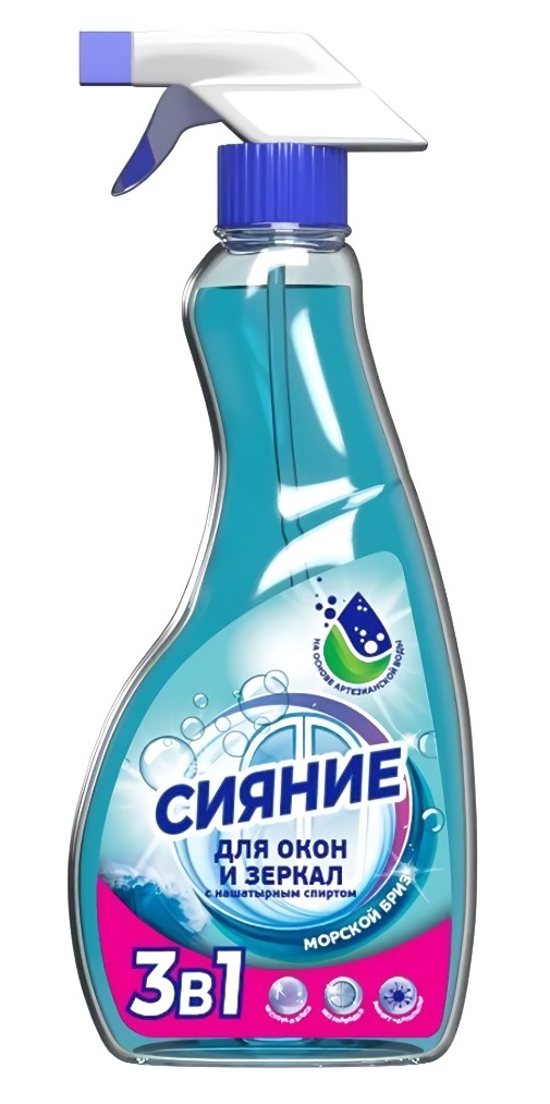 Спрей с нашатырным спиртом Сияние "Морской бриз" предназначен для мытья стекол и зеркал, стеклянных поверхностей витрин и витражей, а также пластиковых окон и твердых полимерных поверхностей от различных видов загрязнений: пыль, грязь, отпечатки пальцев, остатки насекомых.