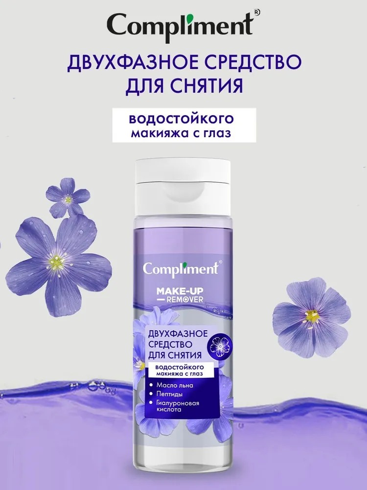 Двухфазное средство для снятия водостойкого макияжа с глаз Compliment (Комплимент) бережно и максимально эффективно удаляет водостойкий макияж с глаз.