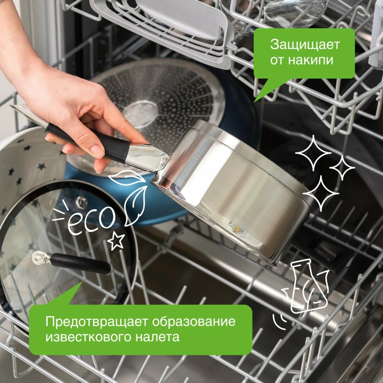 Защищает от накипи и налета внутренние детали посудомоечной машины, продлевая срок ее службы.