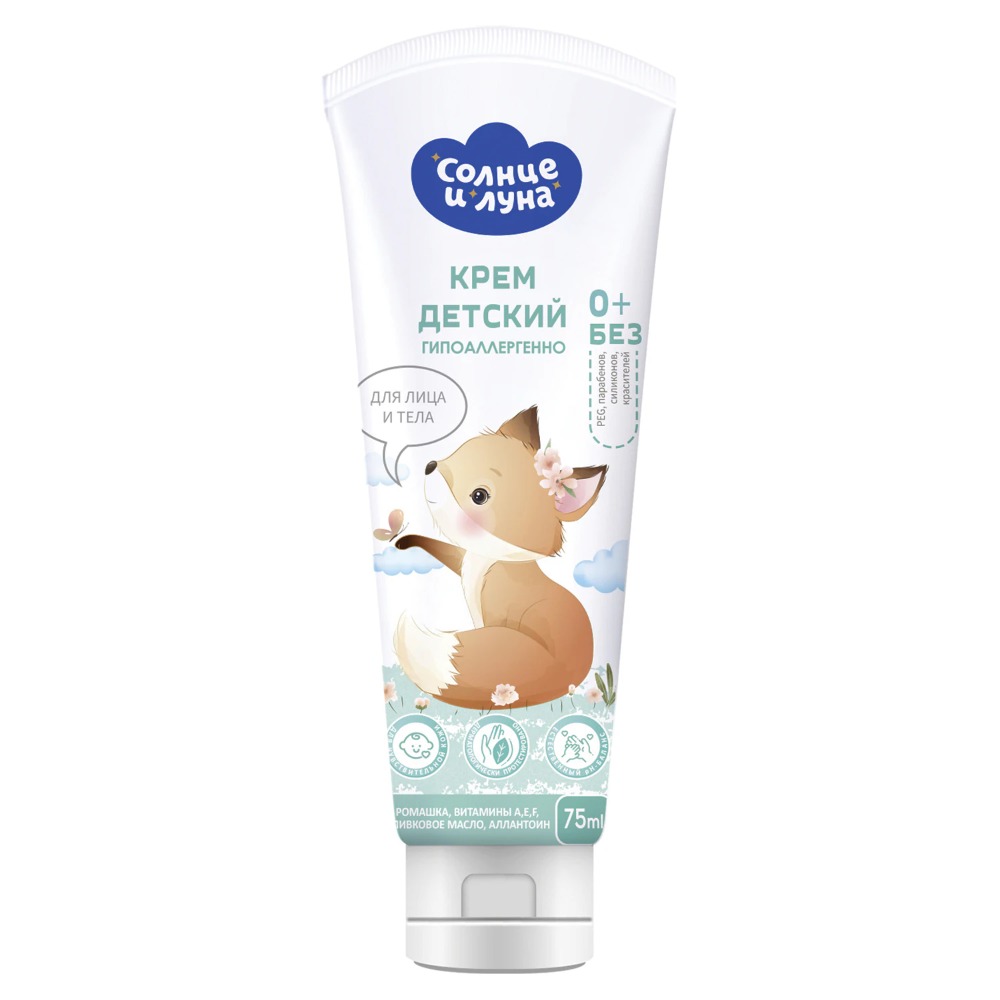 Гипоаллергенный детский крем "Солнце и луна" интенсивно увлажняет нежную кожу малыша в течение всего дня.