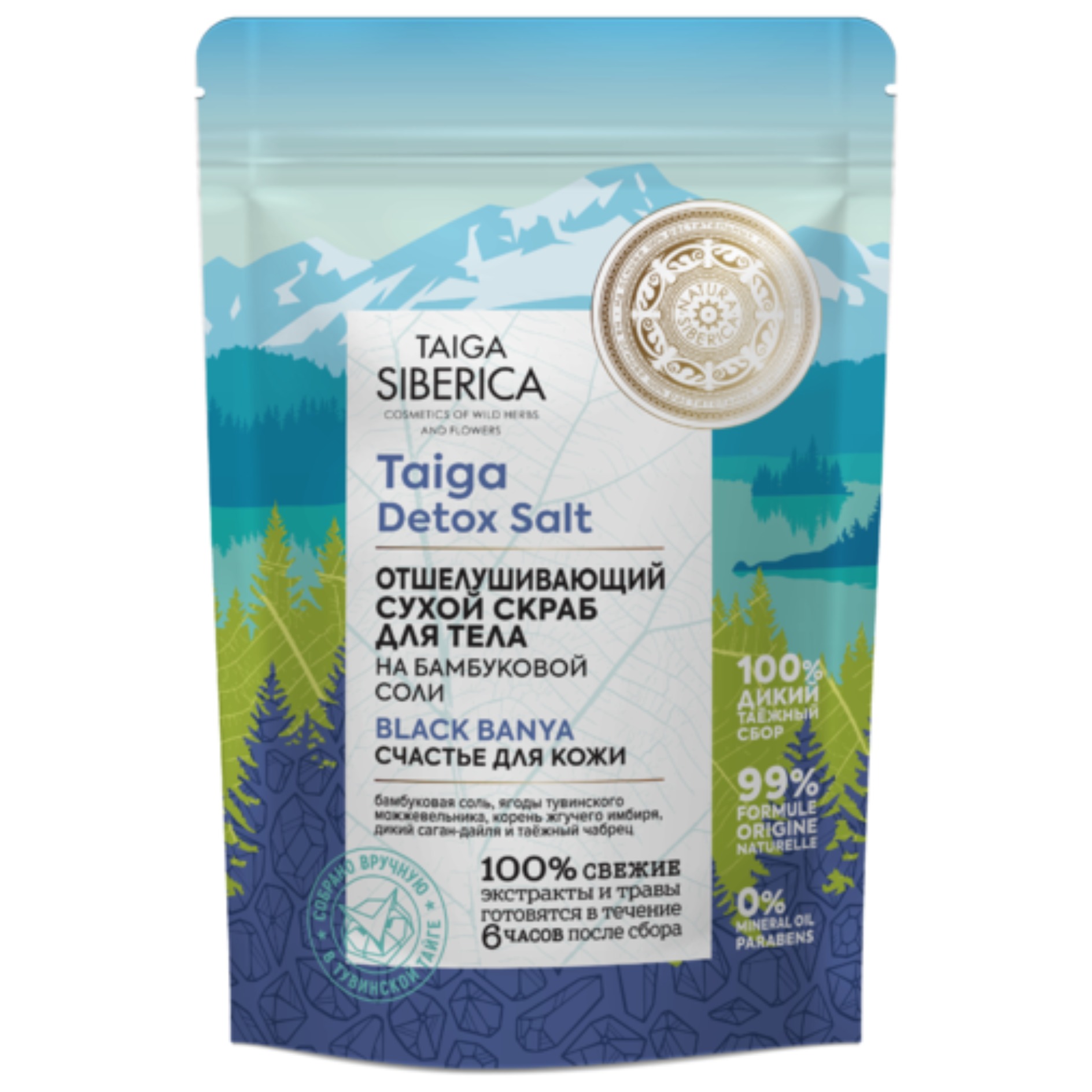Суперконцентрат таежных растений в сочетание с бамбуковой солью эффективно отшелушивает и обновляет клетки кожи, оказывает мощный детокс-эффект.