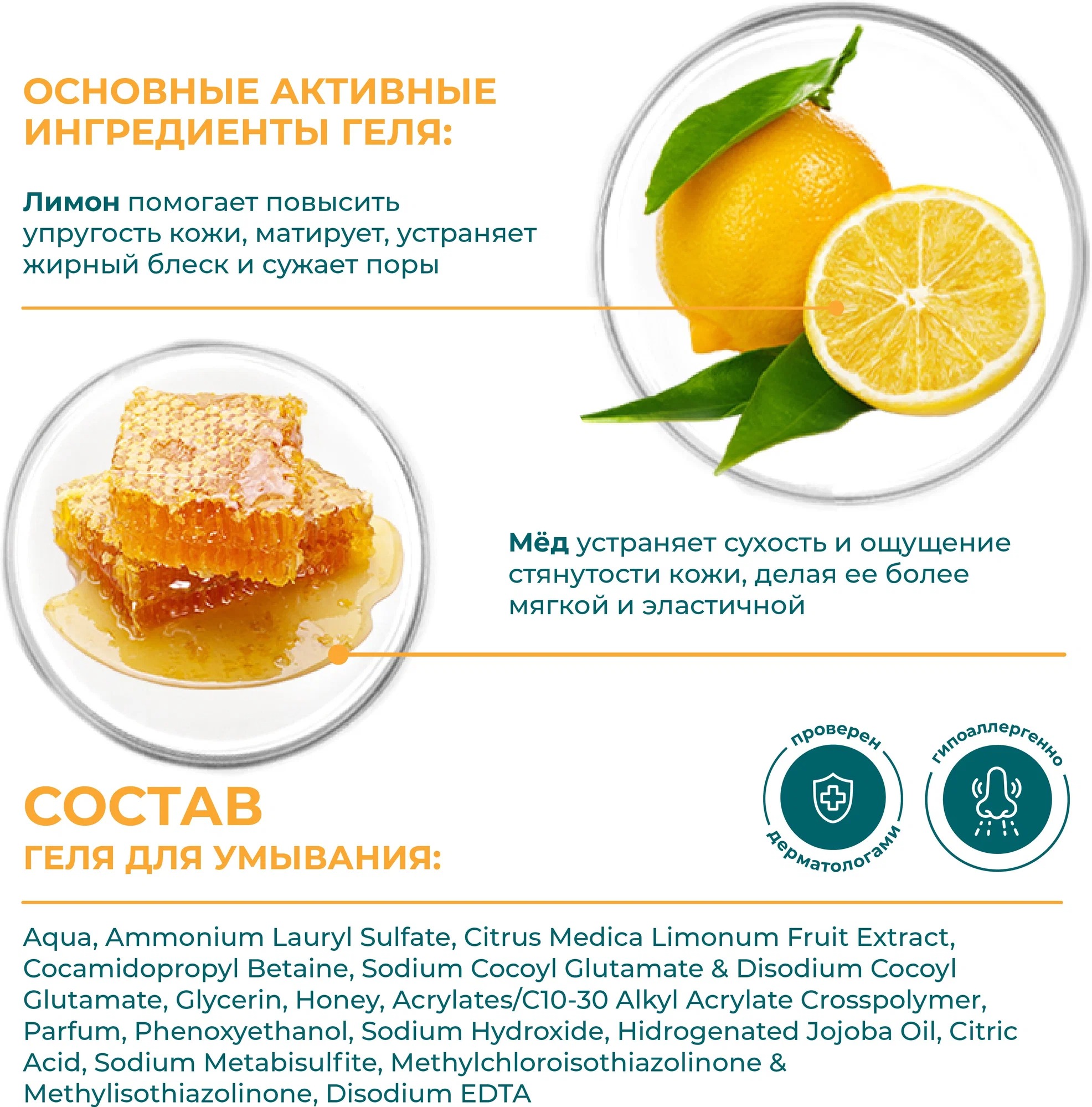Состав: Aqua, Ammonium Lauryl Sulfate, Citrus Medica Limonum Fruit Extract, Cocamidopropyl Betaine, Sodium Cocoyl Glutamate and Disodium Cocoyl Glutamate, Glycerin, Honey, Acrylates/C10-30 Alkyl Acrylate Crosspolymer, Parfum, Phenoxyethanol, Sodium Hydroxide, Hydrogenated Jojoba Oil, Citric Acid, Sodium Metabisulfite, Methylchloroisothiazolinone and Methylisothiazolinone , Disodium EDTA.