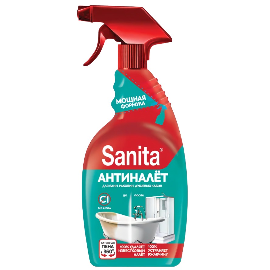 Средство Sanita (Санита) "Антиналет и Антиржавчина" предназначено для ухода за эмалерованными и акриловыми ваннами, душевыми кабинами, раковинами, кранами, кафельной плиткой, унитазами.