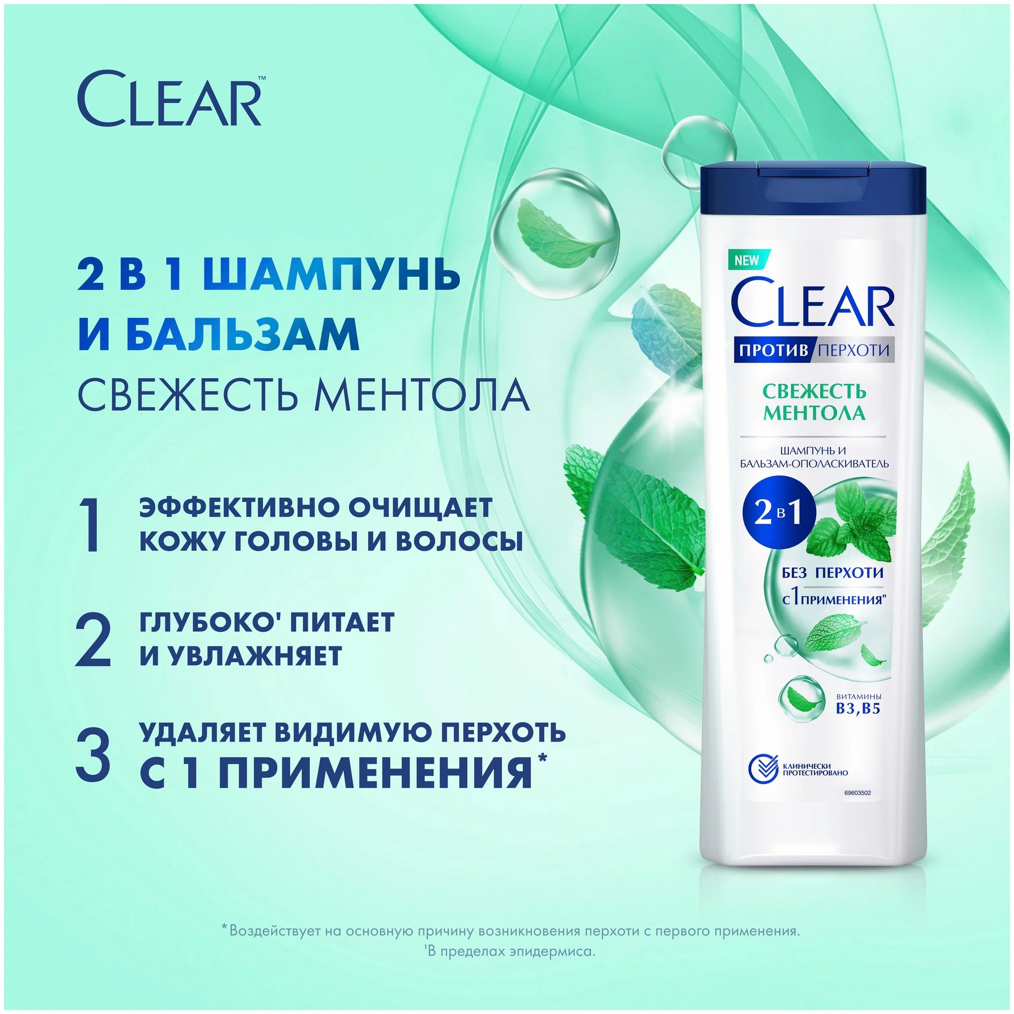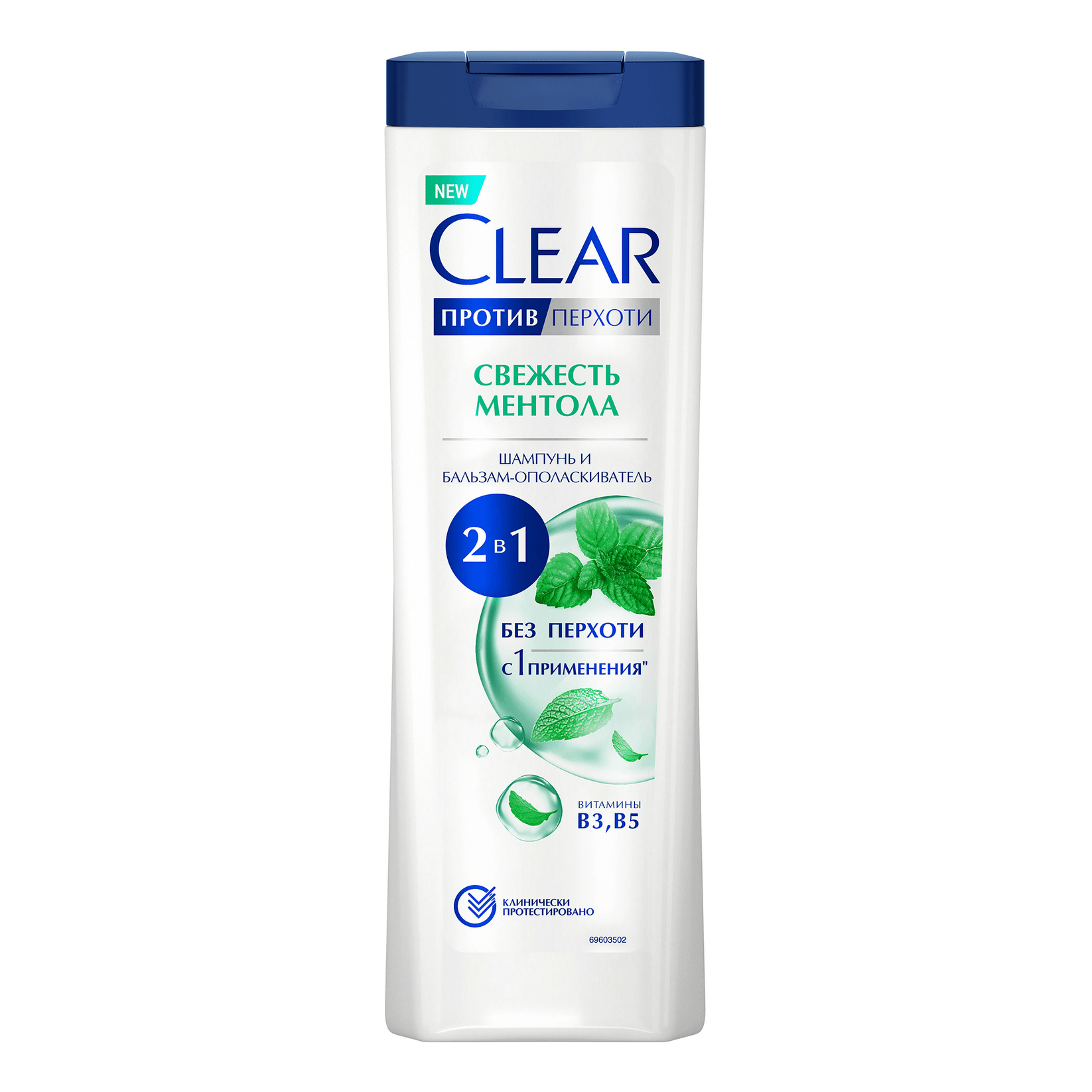 Шампунь и бальзам-ополаскиватель Clear против перхоти 2в1 Ментол помогает бороться с сухостью кожи головы и излишней жирностью волос, обладает приятным ароматом ментола, придающим волосам свежесть.