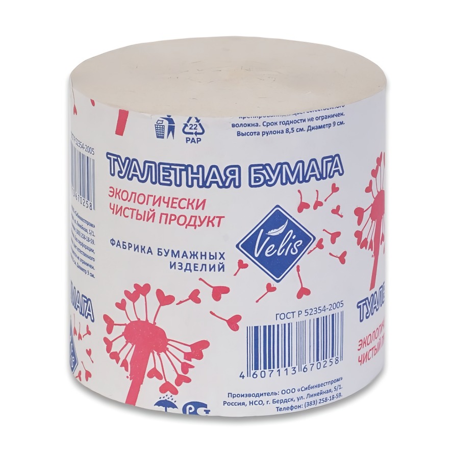 Бумага туалетная Velis (Велис) на втулке, производится из специальной бумаги санитарно-гигиенического назначения, сырьем для которой служит вторичное волокно.