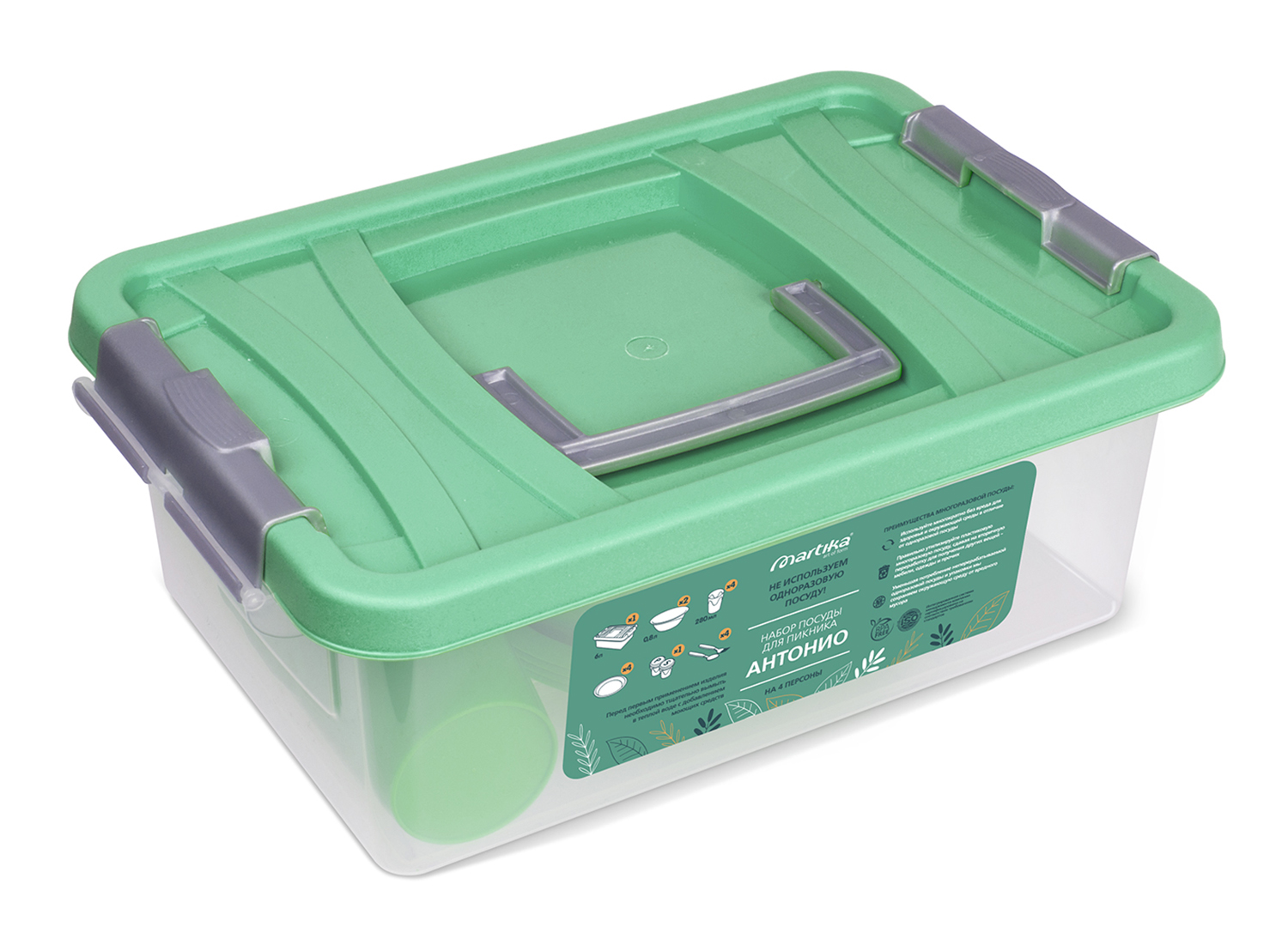 Набор посуды для пикника «Антонио» помещается в пластиковый контейнер объемом 6л. и состоит из 20 предметов: