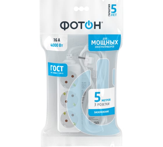 Удлинитель сетевой ФОТОН с заземлением рассчитаны на одновременное подключение приборов суммарной мощностью до 3500 Вт.